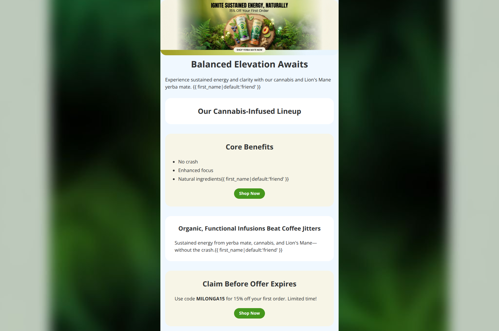 This email delivers strong conversion potential through a visually compelling hero that immediately communicates brand value and the 15% off offer, paired with a logical flow showcasing products and benefits tailored to wellness seekers. The biggest strength is the hero section's integration of imagery, headline, and offer visibility, creating instant relevance. The primary weakness is repetitive generic 'Shop Now' CTAs that lack specificity, diluting urgency and directness.