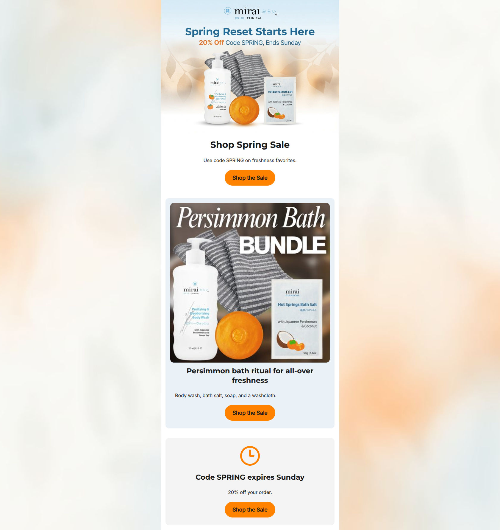 This email functions competently as a basic promotional broadcast, successfully highlighting a 20% off sale and creating urgency. However, it completely misses the mark on Mirai Clinical's specialized brand positioning. It reads like a generic bath product sale rather than a premium, empathetic solution for mature women experiencing age-related body chemistry changes. The extreme repetition of imagery, messaging, and identical CTAs creates a disjointed and slightly lazy user experience that leaves conversion potential on the table.