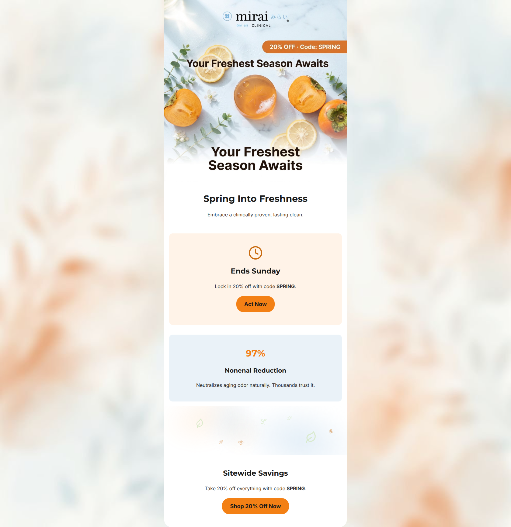 68/100This email effectively communicates a clear promotional offer with strong brand colors, but suffers from a poorly executed hero section. The lack of an immediate Call-to-Action above the fold and repetitive embedded text in the primary image create friction. While the core clinical value proposition (97% Nonenal reduction) is present, it is relegated to a secondary block rather than driving the primary narrative. Fixing the hero structure and elevating the clinical differentiator will significantly improve click-through rates.