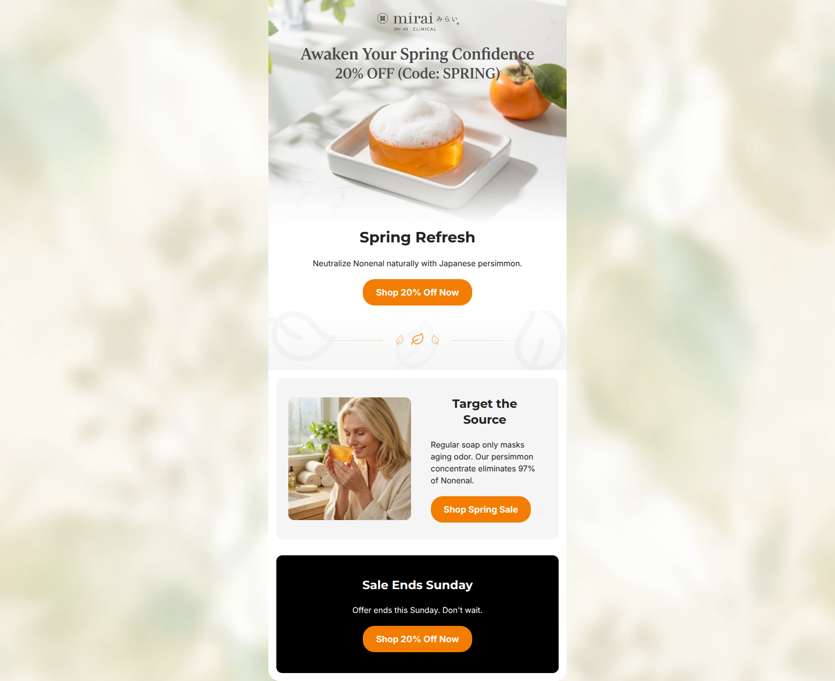 This email is a highly efficient, disciplined piece of promotional marketing that beautifully balances the brand's 'clinical-meets-nature' aesthetic. The copy is exceptionally tight, and the flow logically guides the reader from offer to education to urgency. However, a major conversion roadblock exists: burying the essential promo code inside a graphic image. For a mature demographic, ensuring critical transactional information is presented as highly legible, selectable live text is paramount.