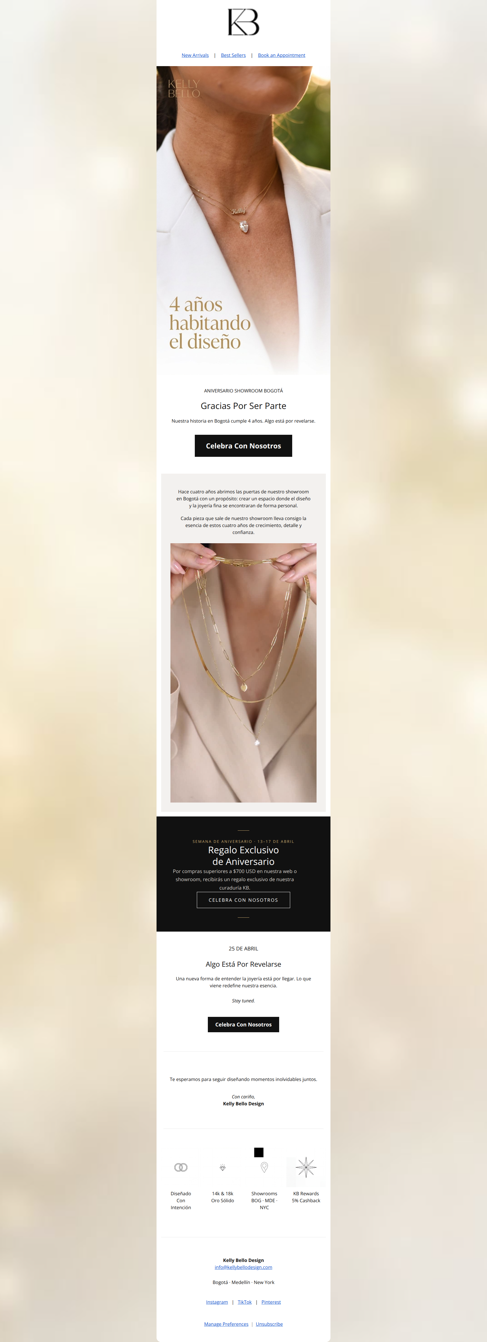 75/100This anniversary email effectively leverages Kelly Bello Design's elegant, minimalist aesthetic and maintains a sophisticated tone. However, it suffers from a vague primary objective. The core offer (a gift with purchase over $700) is buried in the middle of the email behind an opaque teaser in the hero section. Additionally, the email tries to accomplish two different timelines (a promo from April 13-17 and a teaser for April 25), which dilutes the immediate call to action. By pulling the concrete offer up to the hero and giving the promotional CTA more visual weight, the conversion rate will improve significantly.