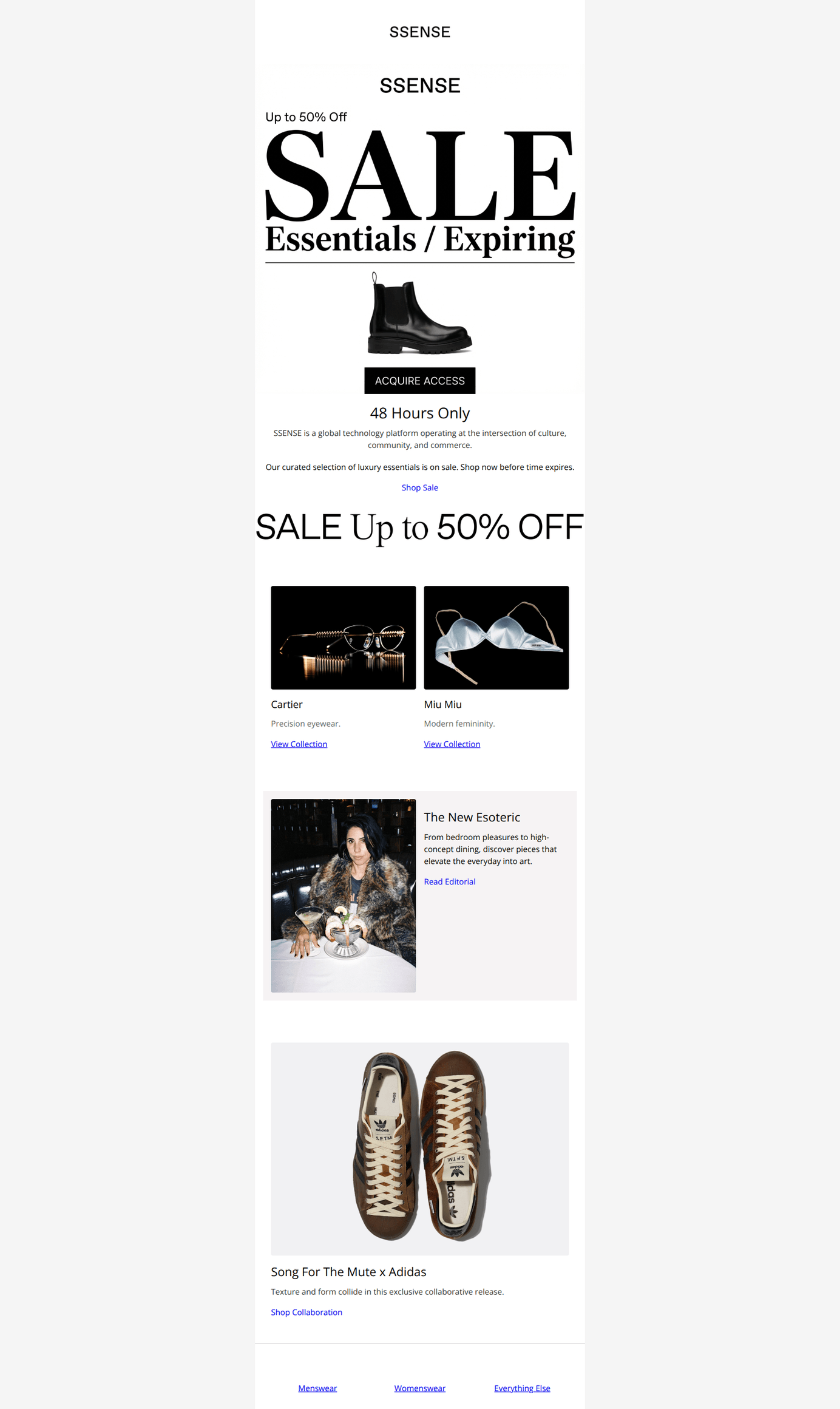 This email adheres to the SSENSE brutalist aesthetic but suffers from significant execution errors that undermine its luxury positioning. The inclusion of generic corporate boilerplate text in the hero section and the presence of default unstyled blue hyperlinks suggest a template malfunction rather than a design choice. While the visual minimalism is on-brand, the content hierarchy is confused by mixed CTA styles and redundant sale headers.