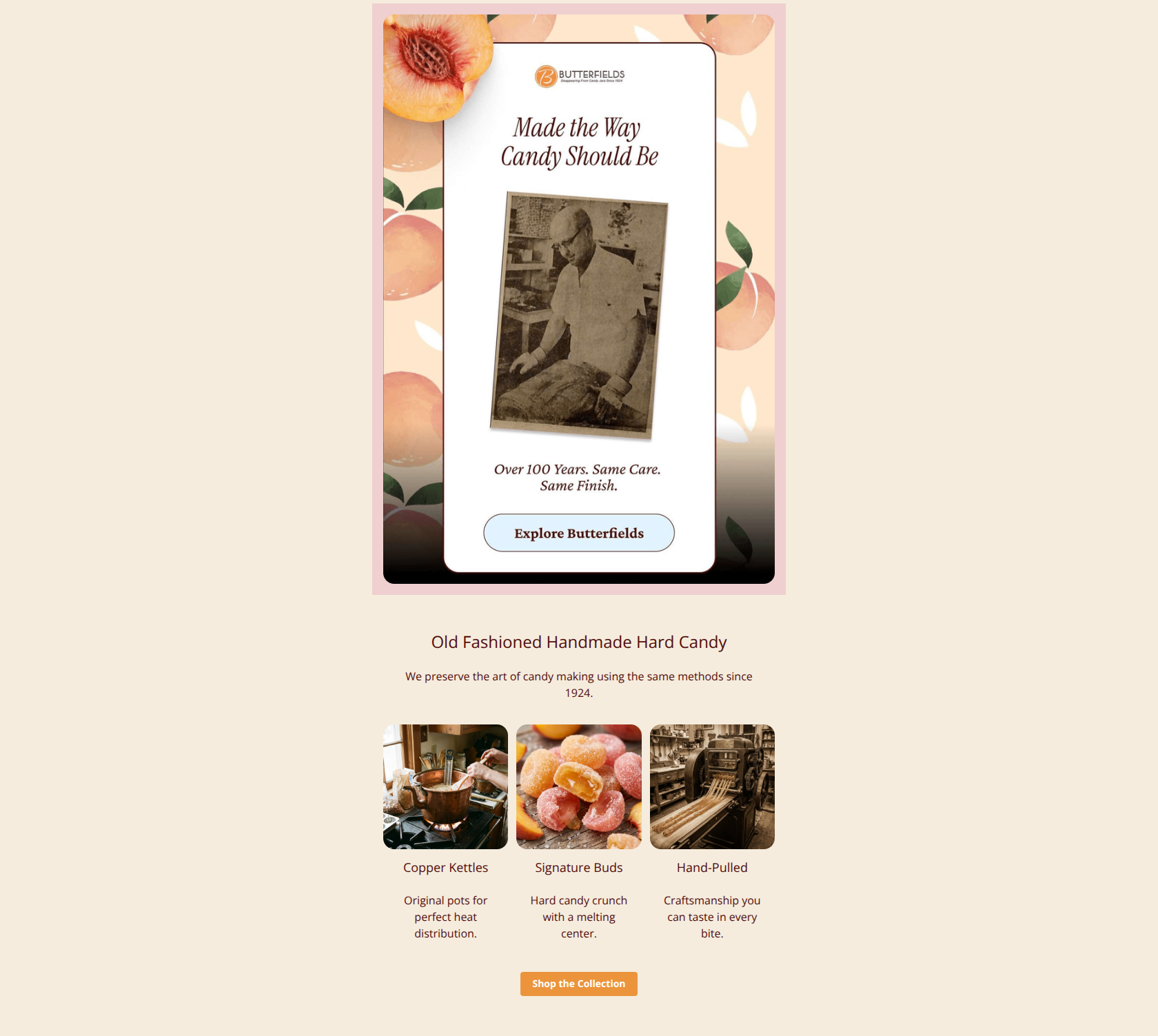 This email excels at establishing brand identity through strong visual storytelling and a cohesive nostalgic tone, effectively communicating the 'handcrafted heritage' value proposition. However, it functions more as a digital brochure than a direct-response marketing asset; it lacks specific product merchandising, social proof, and commercial urgency, relying entirely on the brand story to drive clicks rather than enticing users with specific flavors or offers.