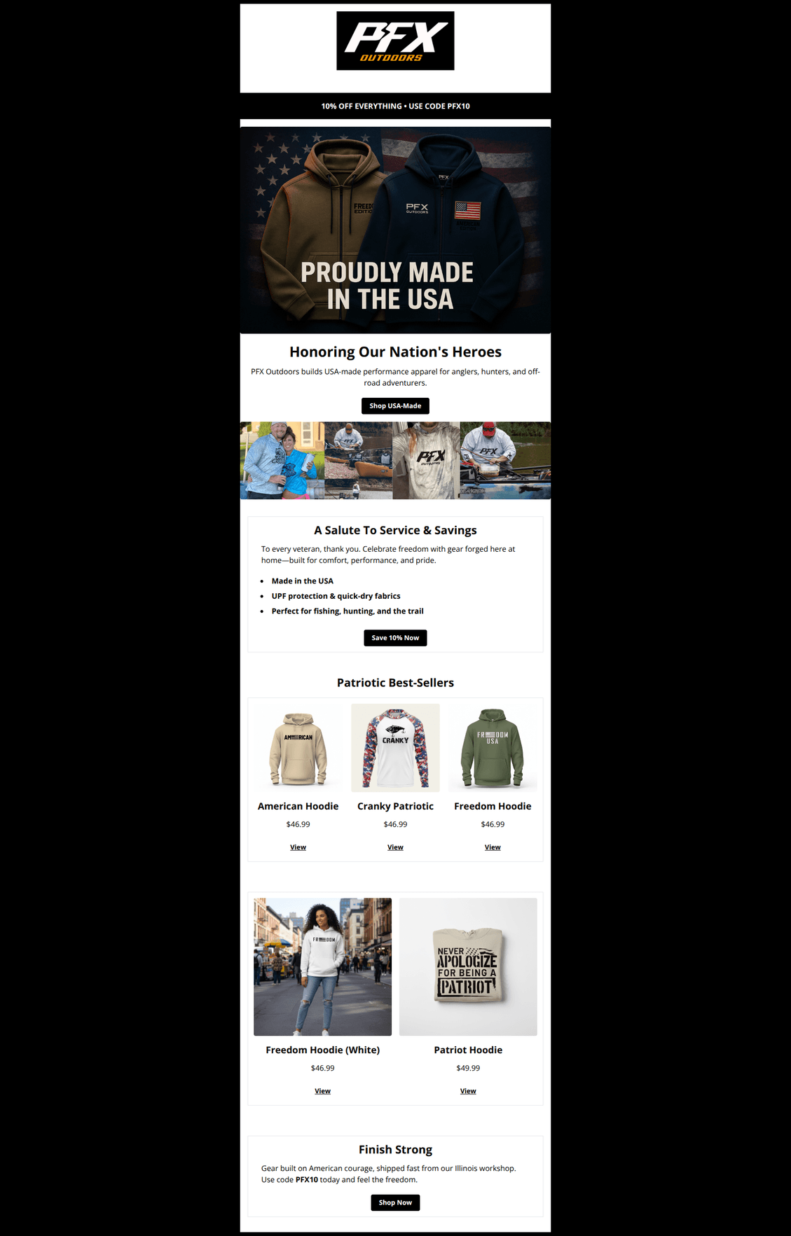 Strong patriotic theme with clear value messaging and clean layout. Conversion can improve by tightening CTA language, reinforcing the offer where purchase decisions happen, and adding urgency and social proof. Align link targets and auto-apply the discount to reduce friction.