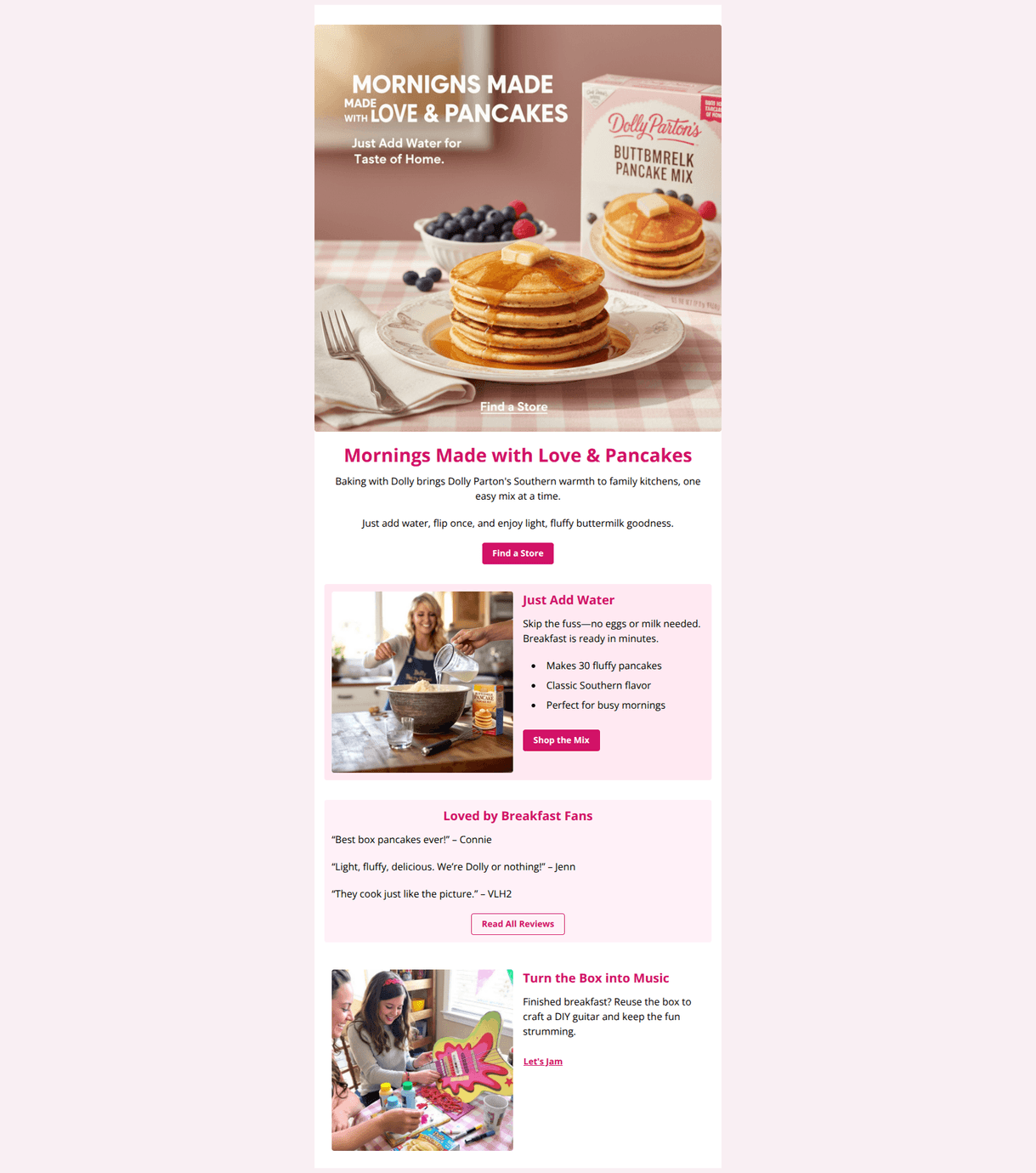 Charming, on-brand email that makes the mix feel warm, easy, and family-friendly. The visuals and copy are strong, but the primary conversion path could be clearer and reinforced with price/retailer cues and front‑loaded social proof. A few quick content tweaks can meaningfully lift clicks to purchase and PDP engagement.