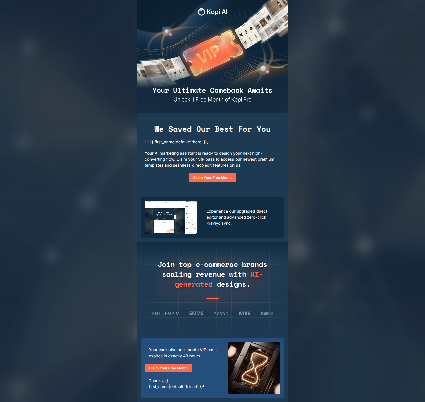 Generate professional email designs like this one in seconds with Kopi AI.