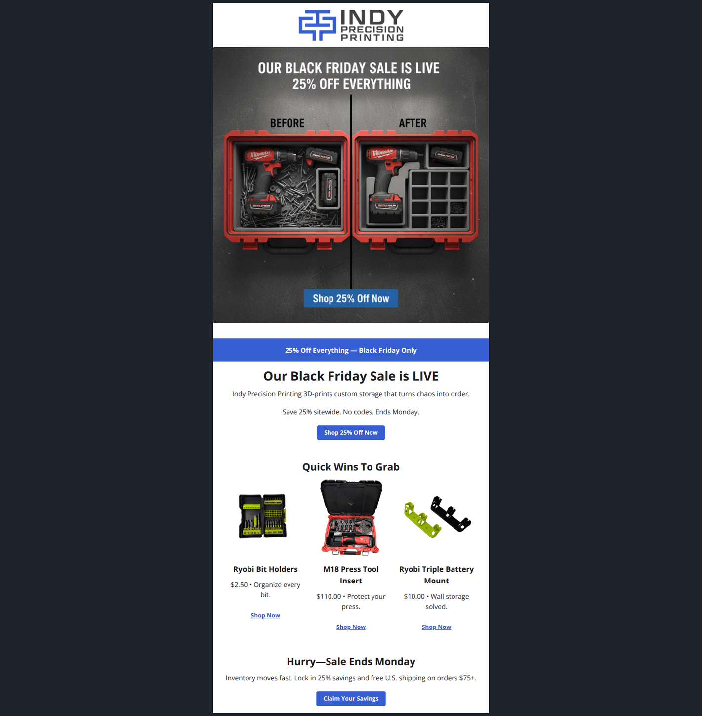 Strong Black Friday promo with a compelling before/after hero and clear sitewide discount. Biggest fix: the timing message conflicts (“Black Friday Only” vs “Ends Monday”), and product tiles don’t show the 25% savings or brand-specific relevance. Sharpen urgency, surface free shipping earlier, and make product CTAs and savings more explicit to lift clicks and AOV.