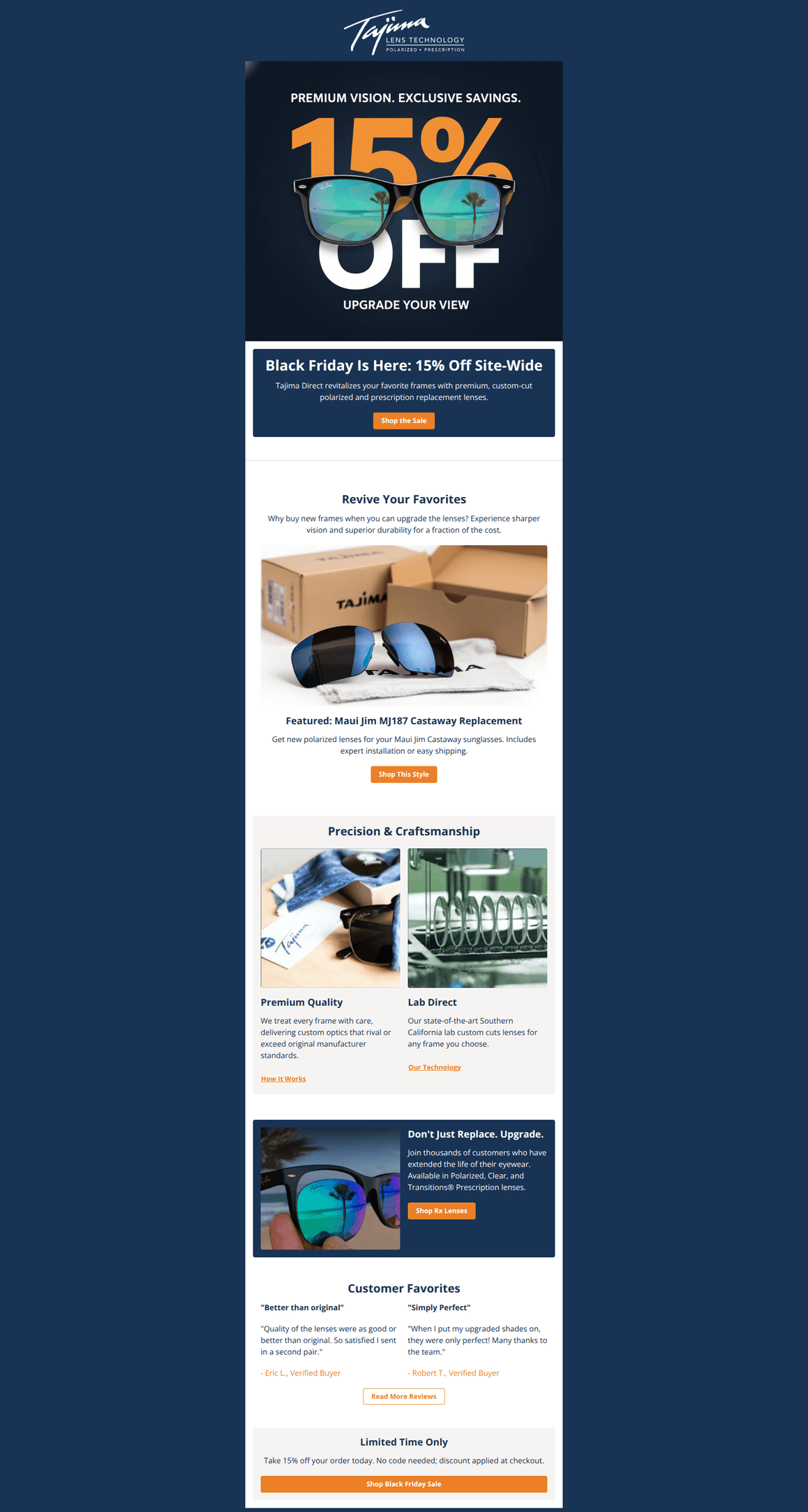 This email features a strong, premium aesthetic that aligns well with the brand's high-quality value proposition. The visual hierarchy is effectively managed through alternating background colors, and the 'Black Friday' offer is communicated clearly without overshadowing the core benefit of lens replacement. However, there are notable accessibility issues regarding color contrast for text links and secondary buttons, and the product spotlight section runs the risk of being too specific if the list isn't heavily segmented.