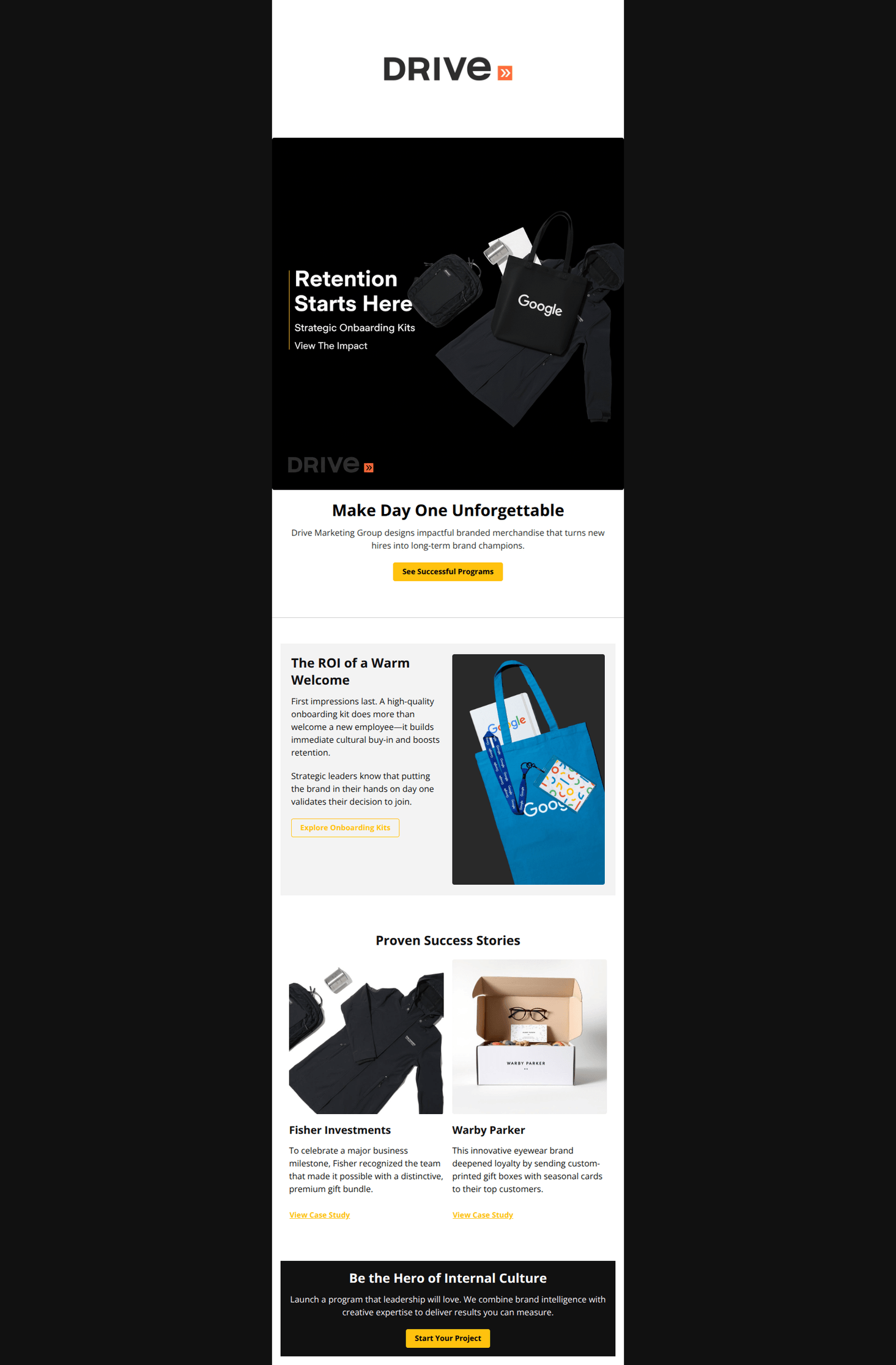 This is a polished, high-impact B2B email that effectively uses social proof and a clear narrative to sell merchandise solutions. While the visual hierarchy and storytelling are strong, the design suffers from critical accessibility issues regarding color contrast on secondary actions and reliance on image-embedded text in the hero.