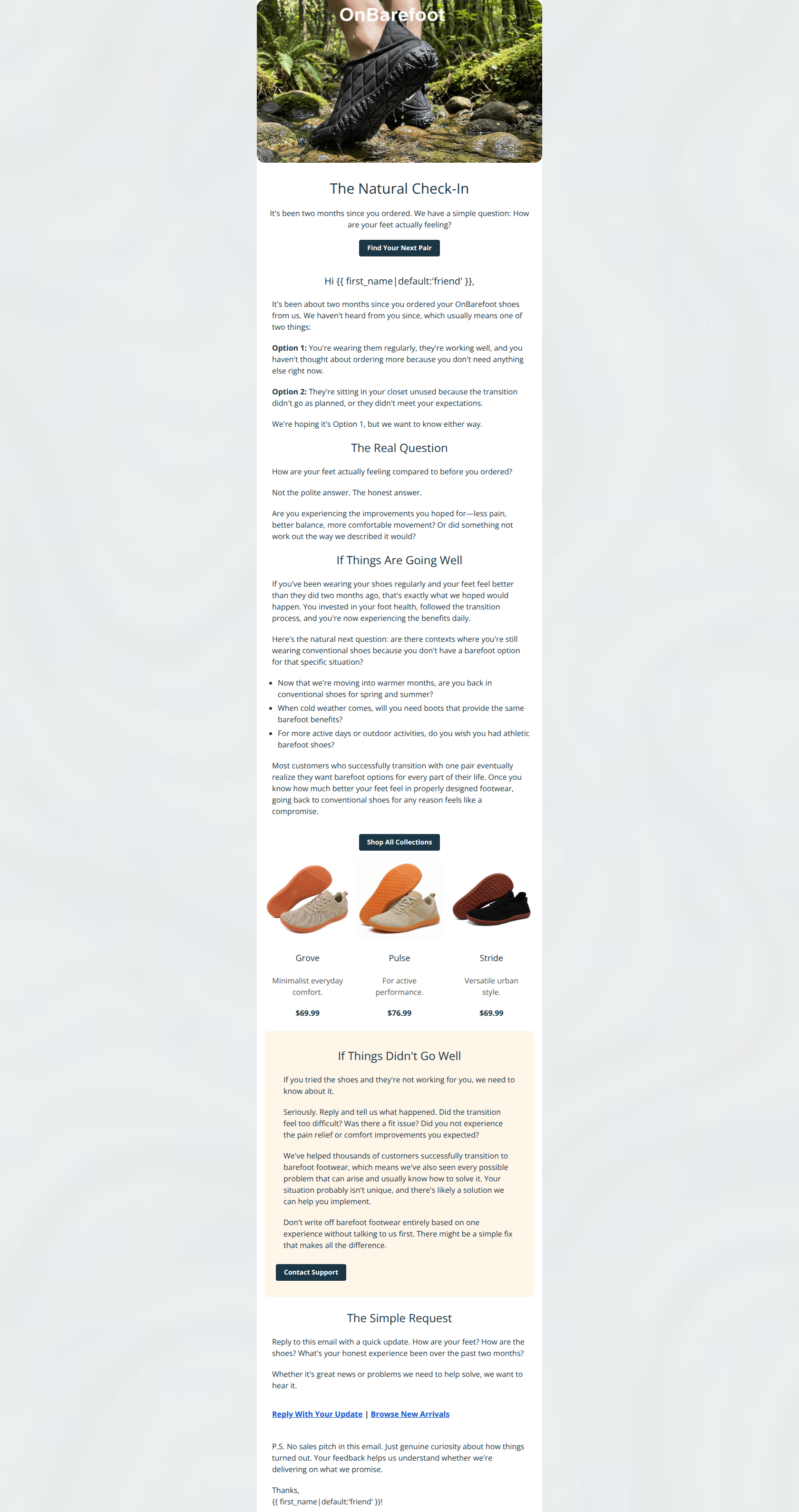 This email attempts a sophisticated post-purchase 'check-in' but undermines its own authenticity with conflicting signals. While the tone is appropriately educational and the visual hierarchy is clean, the email suffers from a major identity crisis: it claims to be a genuine, non-salesy welfare check ("P.S. No sales pitch in this email"), yet aggressively pushes a "Find Your Next Pair" button in the hero and includes a product grid. This contradiction erodes trust and confuses the user's primary path.