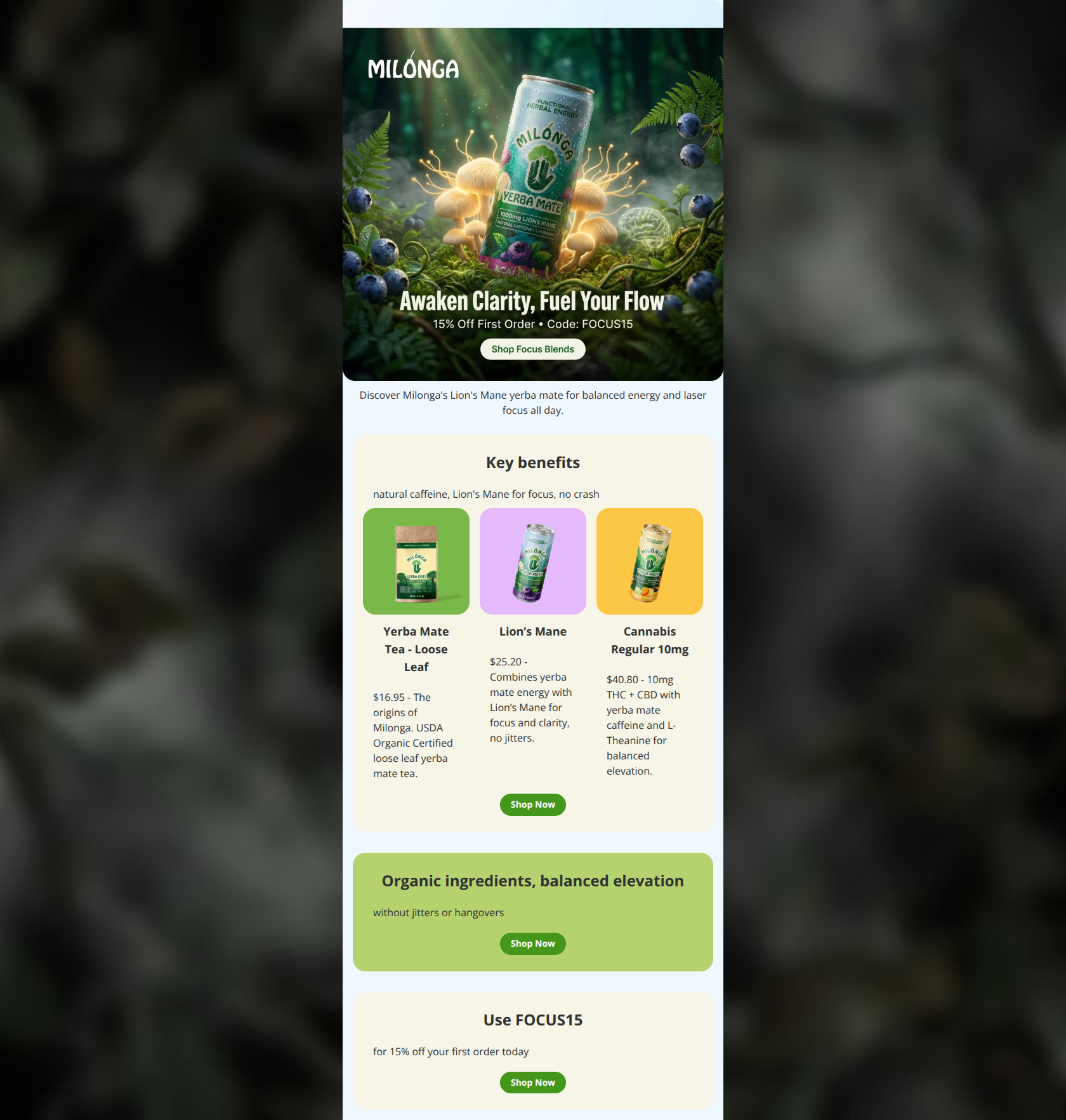 This email delivers a strong, focused promotion for Milonga's Lion's Mane yerba mate, with a visually compelling hero and clear benefits that align well with the brand's wellness audience, positioning it above average for clicks. The standout strength is the hero section's immediate communication of brand value through imagery and tagline. The primary weakness is repetitive, generic 'Shop Now' CTAs that dilute urgency and specificity.