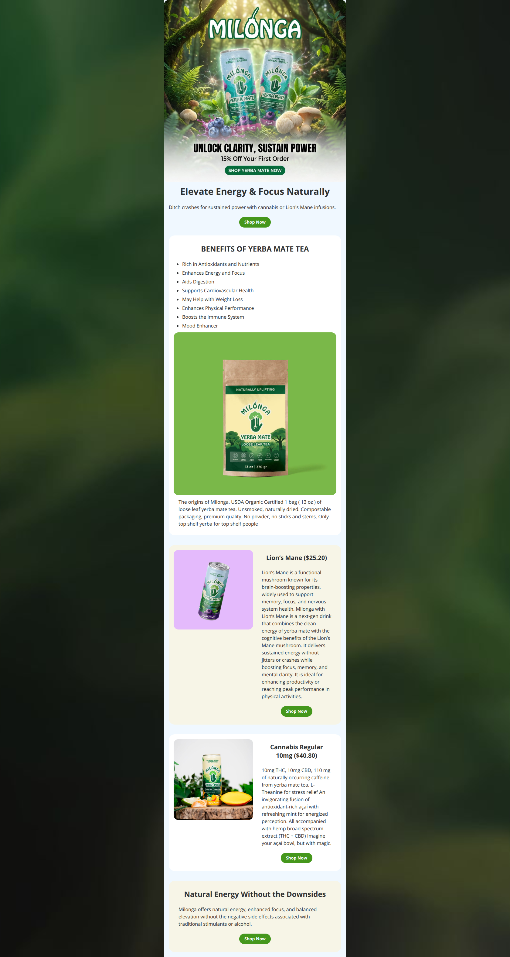 This promotional email effectively communicates Milonga's value proposition of natural, functional energy through a strong hero, clear product spotlights, and benefit-focused copy, likely driving solid clicks from wellness seekers. The biggest strength is the visually appealing product sections that highlight specific infusions with prices and CTAs. The primary weakness is the under-emphasized 15% off offer, buried in the hero image rather than prominent text, reducing urgency.