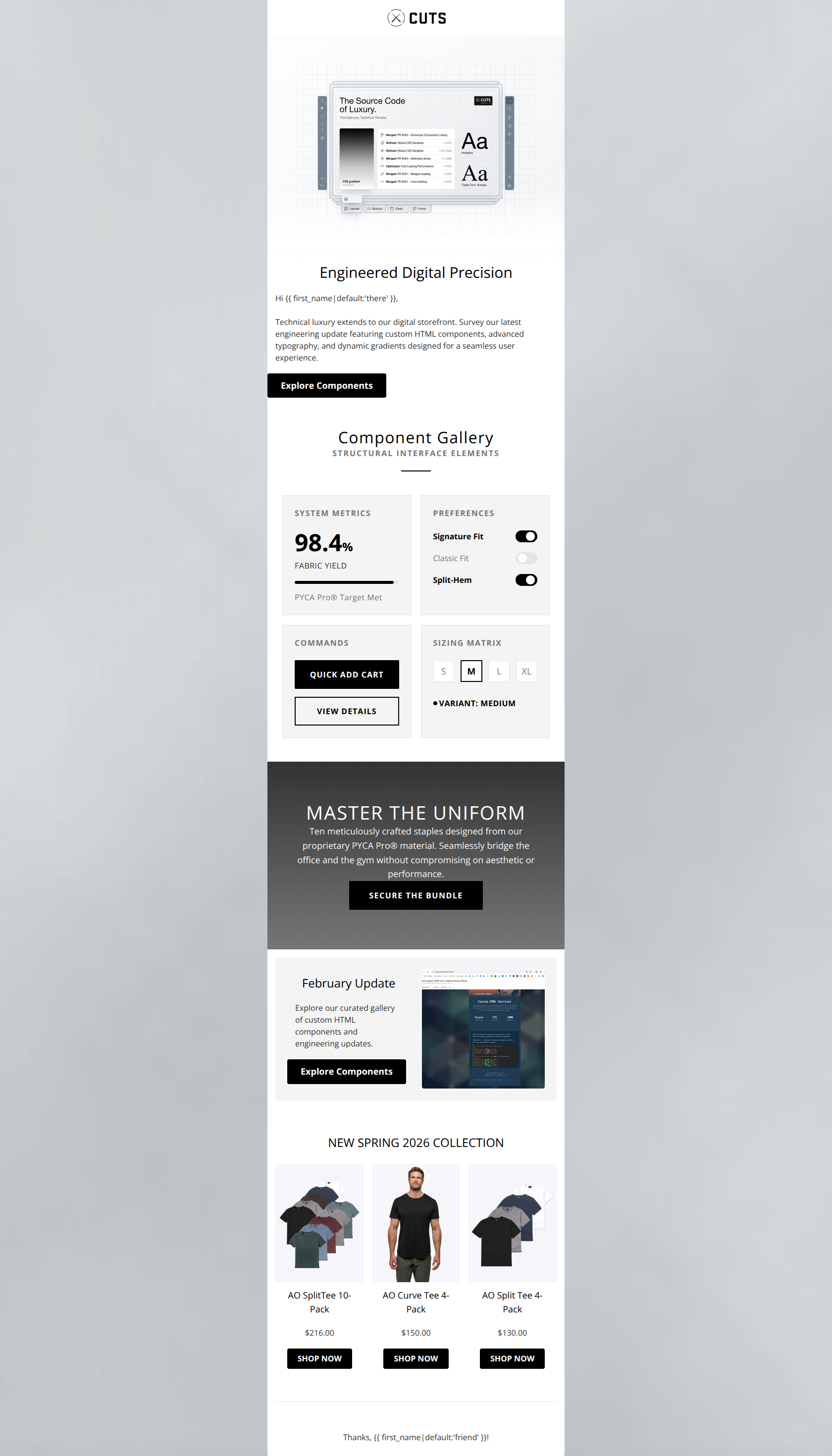 This email suffers from a critical failure: the hero section and primary narrative focus inexplicably on web development updates ("custom HTML components") rather than selling premium apparel. While the visual design is stark and on-brand, this massive conceptual disconnect will severely damage conversion rates by confusing the target audience.