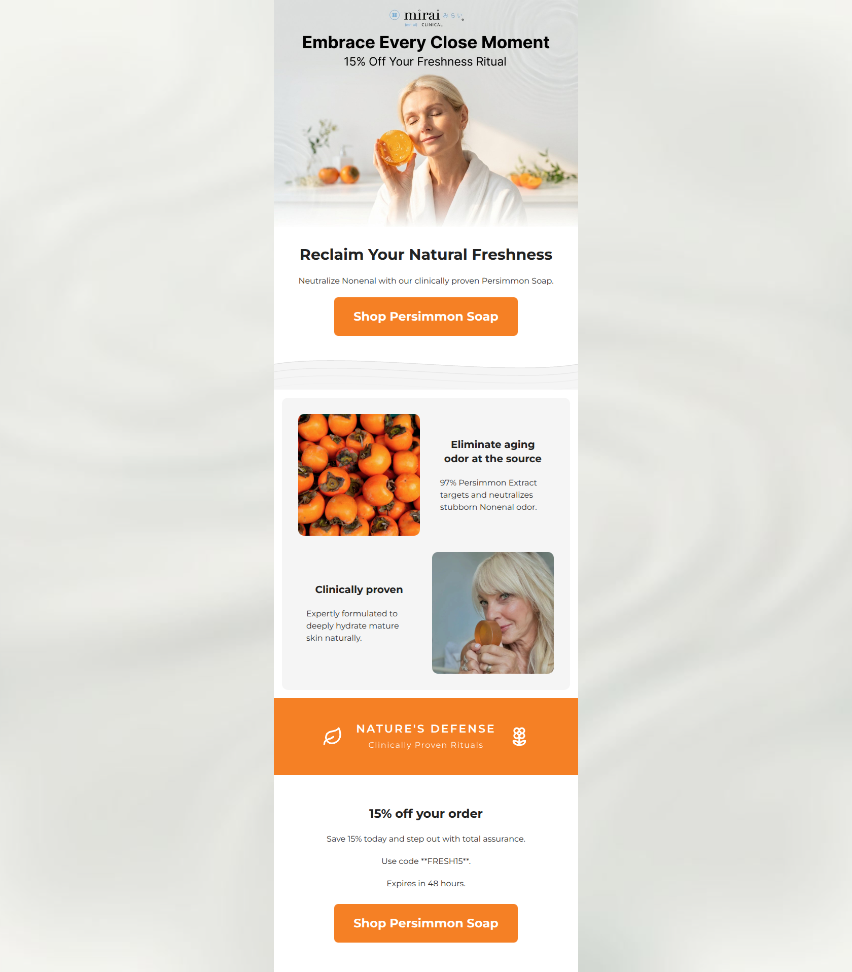 This is a strong, highly targeted promotional email that speaks directly to the core demographic with empathy and dignity. The visual aesthetic matches the brand's 'clinical yet natural' positioning beautifully. However, structural decisions—specifically burying the promo code at the bottom and baking vital copy into the hero image—create unnecessary friction in the conversion path.
