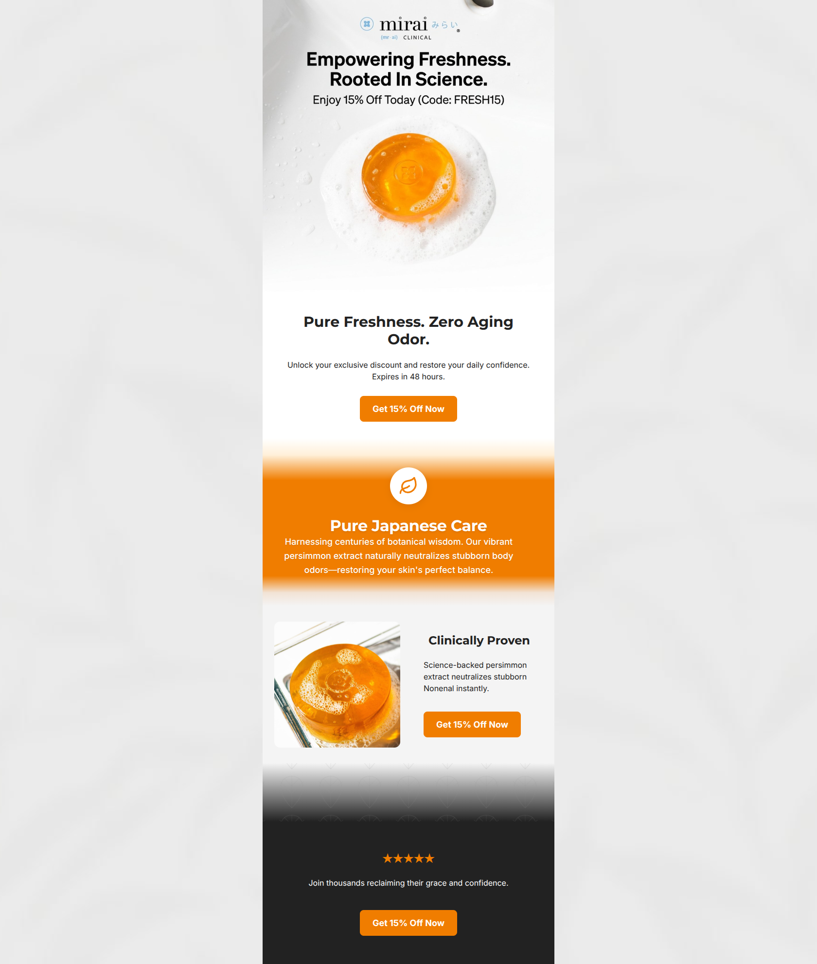 74/100This email effectively communicates the core value proposition of Mirai Clinical—neutralizing aging odor with persimmon extract—while maintaining a respectful and empowering tone. However, the visual hierarchy is compromised by a heavy, graphic-based middle section that competes with the calls-to-action, and the promotional code is trapped within an image. Optimizing the visual flow and diversifying the CTA copy will significantly improve the click-through rate.