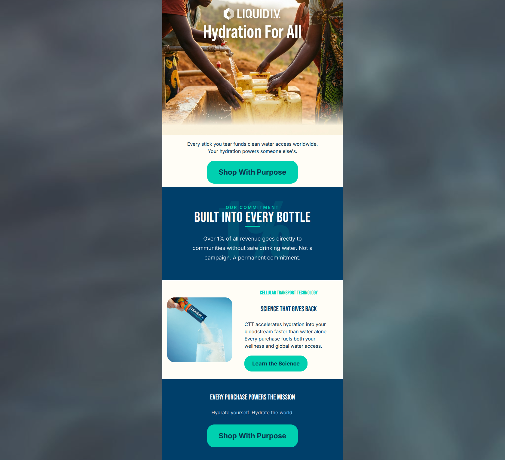 This email effectively communicates Liquid I.V.'s commendable social mission but struggles to balance this narrative with compelling e-commerce drivers. While the emotional resonance is strong and the copy is generally concise, the lack of immediate product visibility in the hero and a 'dead zone' in the middle of the email introduce friction into the conversion path. It reads slightly more like a corporate CSR announcement than a high-converting promotional email designed to drive immediate sales.