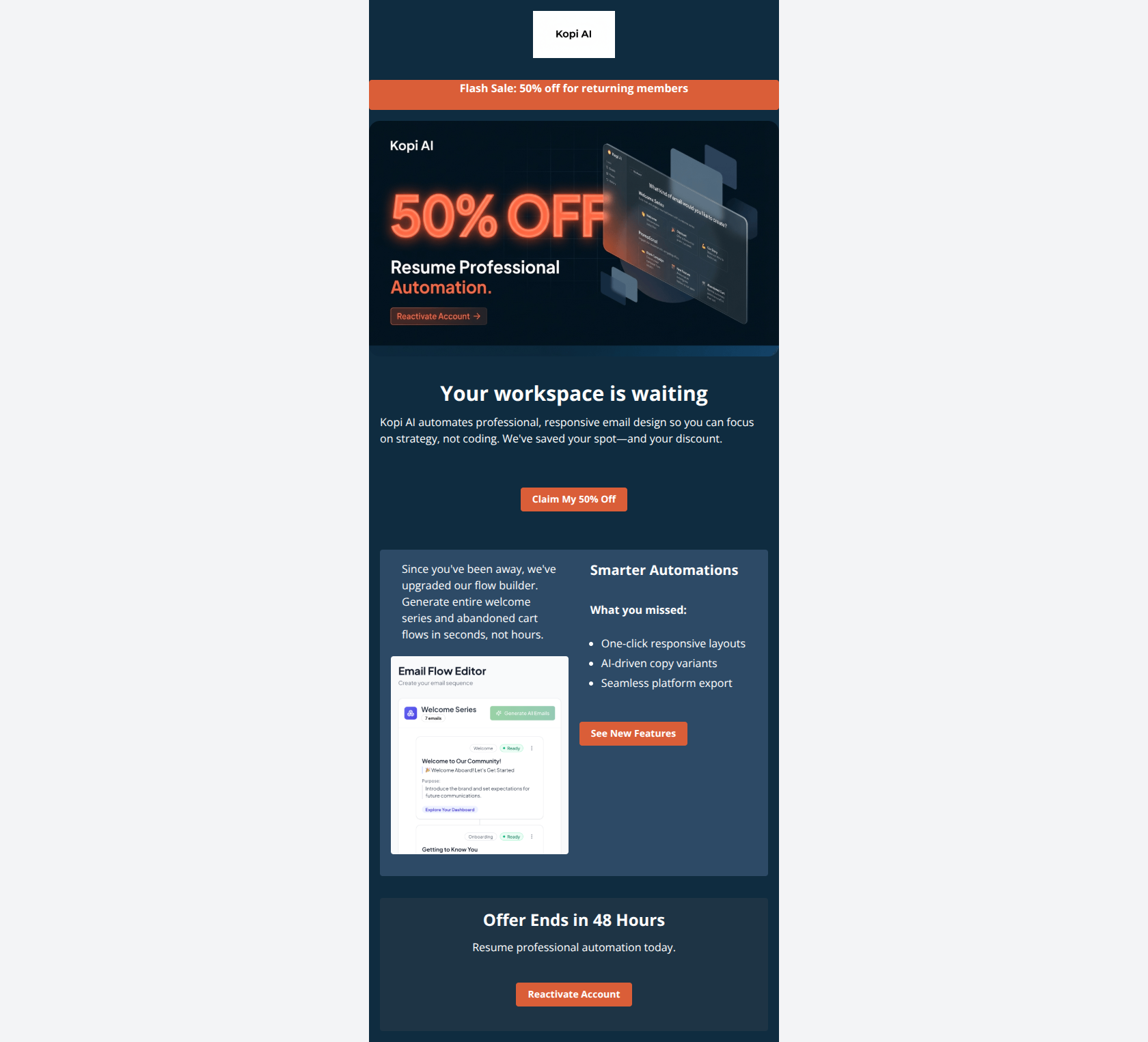 This is a strong reactivation email that effectively leverages a high-value offer (50% off) and a clear 'what you missed' narrative to entice dormant users. However, for a design tool brand, the visual polish in the header (non-transparent logo) undermines the premium feel, and the hero section suffers from 'fake button' confusion within the image.
