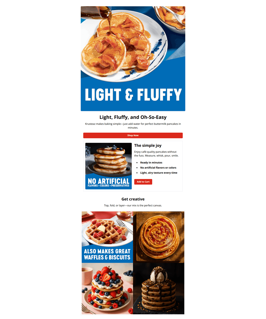 Strong product showcase with appetizing visuals and clear primary CTA. Biggest gaps are the lack of price/offer, minimal social proof, and missed linking/copy opportunities in the inspiration grid. Tightening claims, adding trust and a bottom CTA will materially lift conversions.