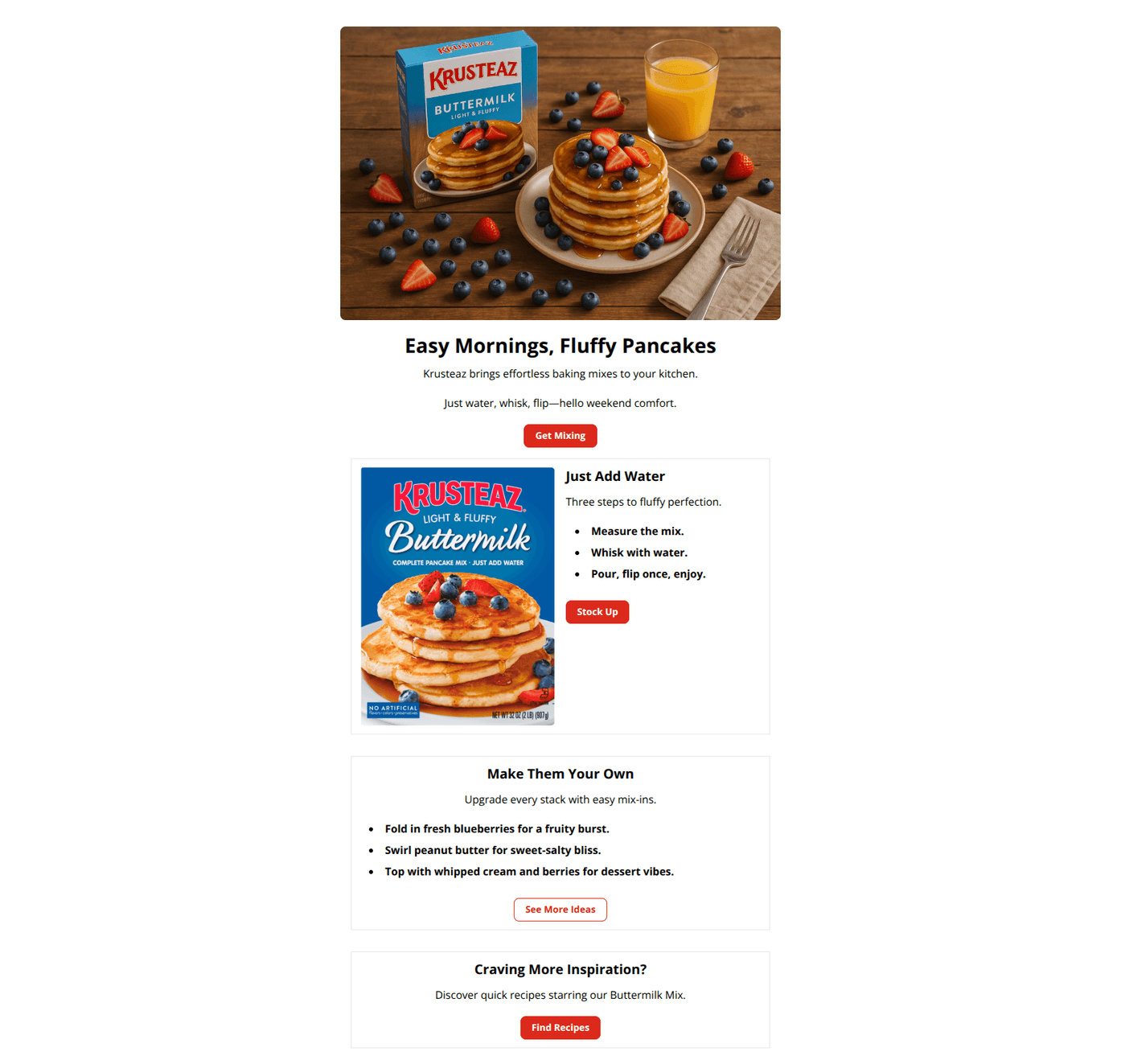 Strong, appetizing creative with clear benefits and tidy flow. Biggest opportunities: sharpen the shopping intent (clearer CTA + price/value cues), add social proof, and include an alternate path for inβstore buyers. A few small tweaks will reduce friction and likely lift click-to-purchase and AOV.