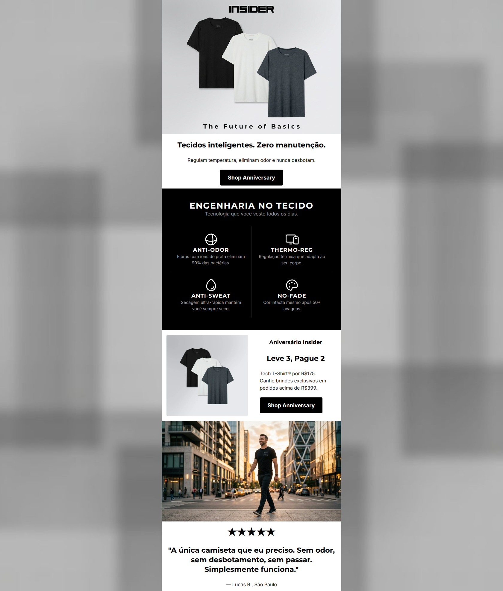 82/100This is a strong, highly scannable email that effectively communicates the brand's core value proposition of functional, low-maintenance apparel. The structural flow from benefit to technical proof to offer to social proof is excellent. However, the email suffers from a jarring visual disconnect: a highly chaotic, colorful promotional graphic that completely breaks the brand's sophisticated, monochromatic 'Silicon Valley' aesthetic. Additionally, linguistic inconsistency between the Portuguese copy and English CTAs introduces unnecessary friction.