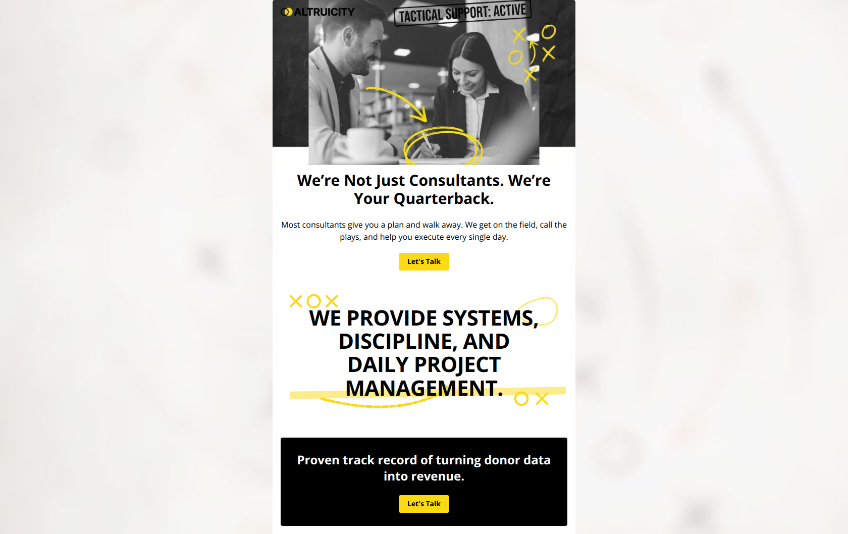 This email succeeds visually with a distinct, high-energy brand aesthetic that perfectly matches the 'quarterback' positioning. However, it relies entirely on high-level assertions ('we help you execute') without providing the concrete evidence (metrics, testimonials, case studies) required to validate those claims for a skeptical non-profit leader.