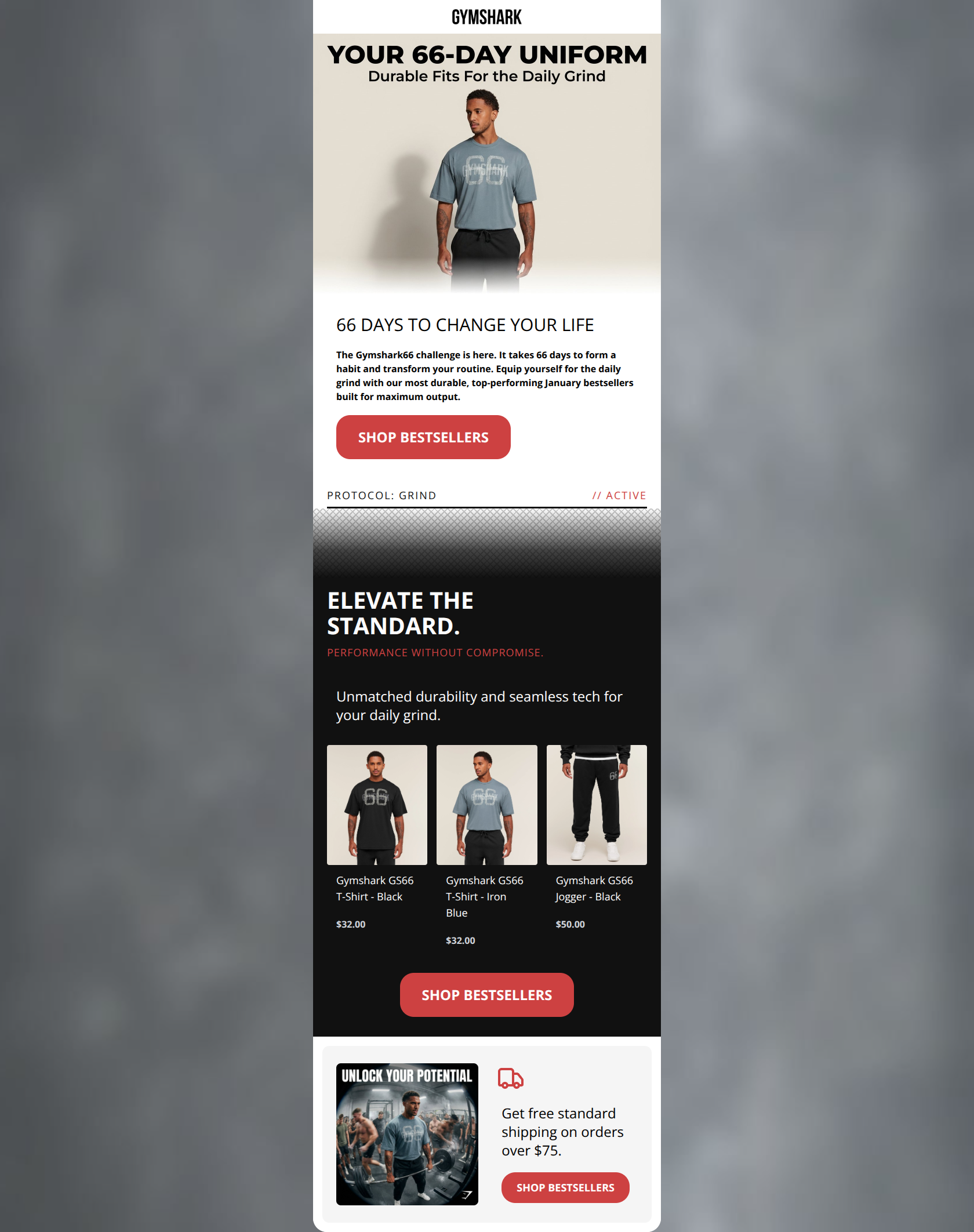 76/100This email strongly captures the Gymshark brand identity, leveraging the high-contrast 'Industrial Athlete' aesthetic and motivational tone perfectly tailored to its Gen Z/Millennial audience. It effectively promotes the 'Gymshark66' challenge as a compelling reason to purchase. However, the email falls short in its Call-to-Action strategy, relying on repetitive, generic copy. Additionally, minor visual hierarchy issues, such as poor contrast on a secondary headline and redundant text between the hero image and HTML body, create unnecessary friction. Addressing these structural and copy details will elevate this from a visually striking email to a high-converting one.