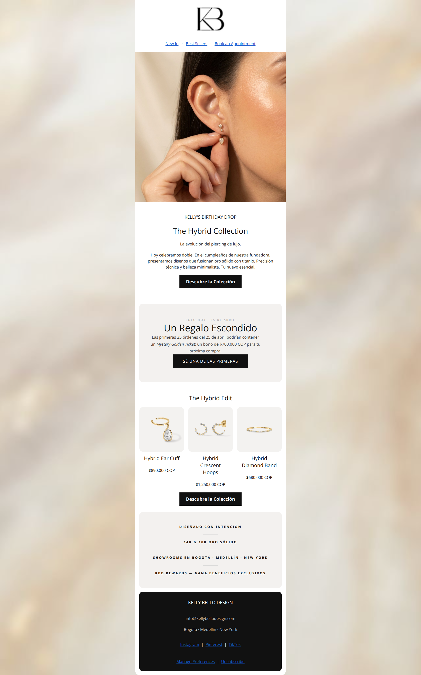 82/100This is a highly competent promotional email that successfully balances luxury branding with a strong conversion incentive. The editorial photography, sophisticated color palette, and logical flow create a premium experience. The inclusion of a 'Mystery Golden Ticket' adds excellent urgency and excitement to a standard product launch. However, the email relies slightly too much on dense, centered paragraphs in key areas, which slows down scannability. Tightening the copy and using typographic emphasis on the core offer will elevate this from a strong email to a high-converting powerhouse.