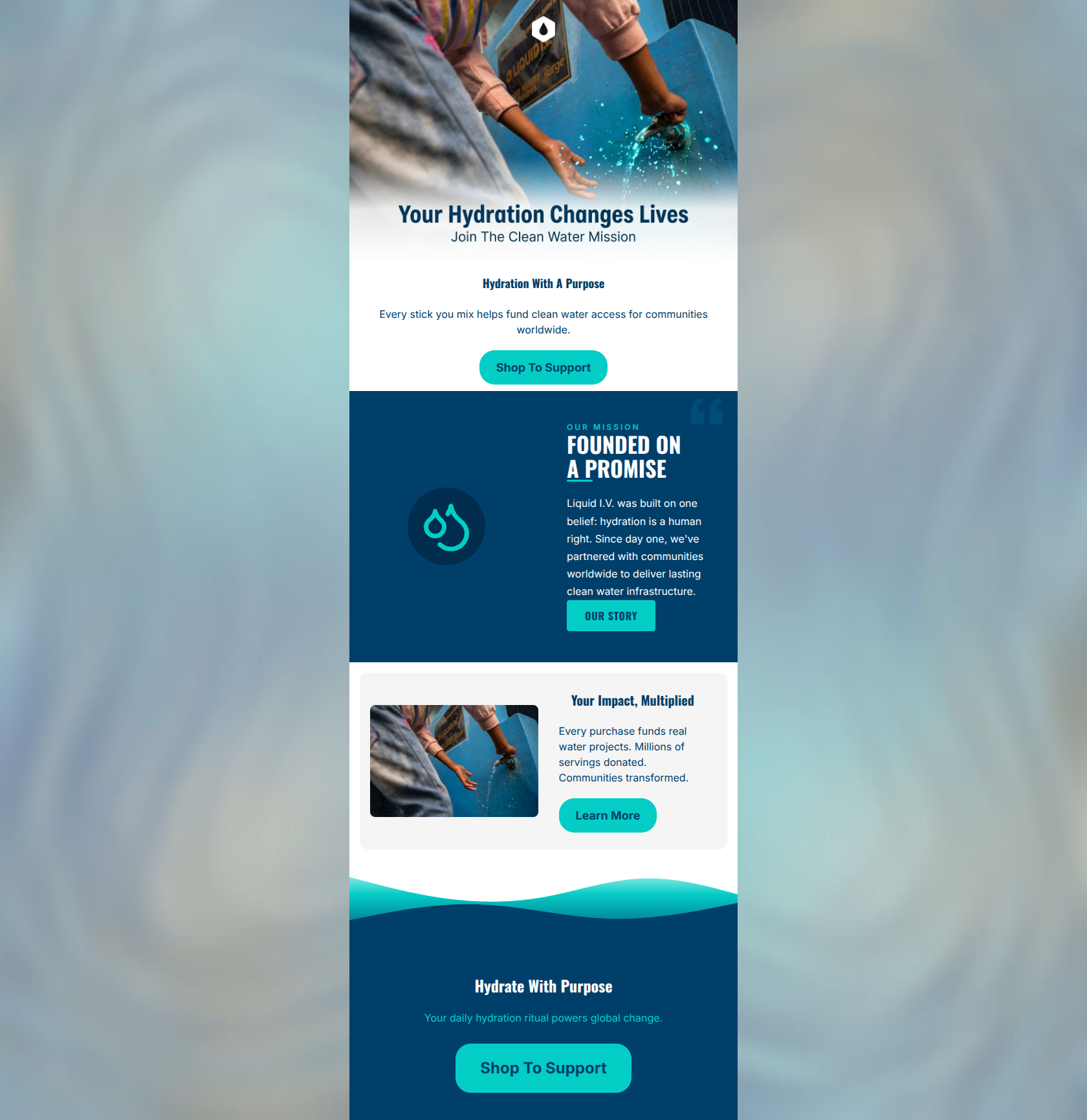 65/100This email looks clean and effectively communicates Liquid I.V.'s commendable clean water mission. However, as a conversion vehicle to drive clicks, it suffers from a one-dimensional, highly repetitive message. It reiterates the 'buy to support' sentiment four distinct times without ever mentioning the functional benefits of the product to the user (hydration, energy, taste). It reads more like an NGO newsletter than a premium supplement brand driving sales, leaving money on the table by ignoring the 'selfish' reasons consumers buy the product.