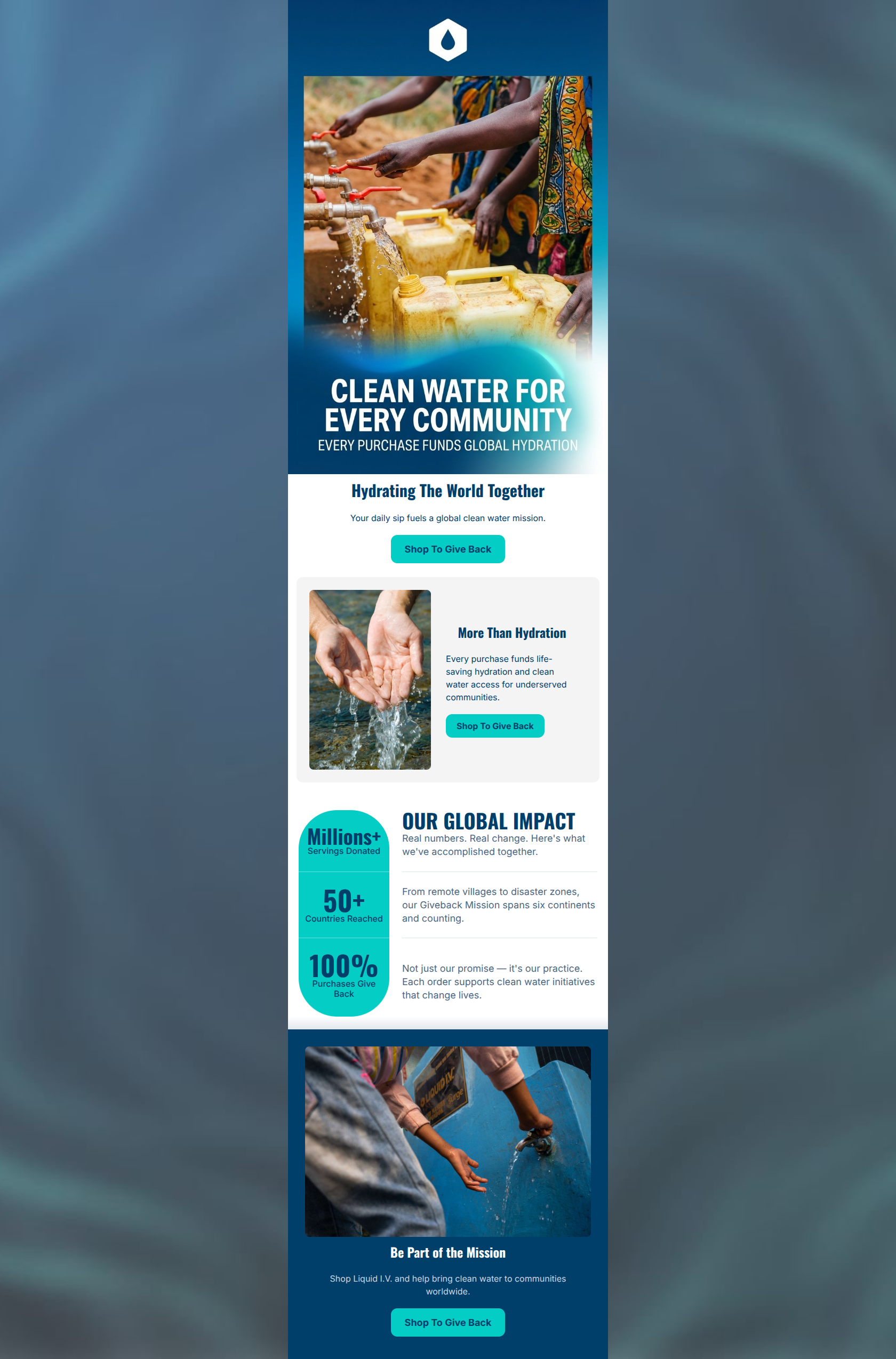 73/100This email does a visually striking job of communicating Liquid I.V.'s 'Giveback Mission' using strong brand colors and emotive imagery. However, it struggles with conversion optimization because it leans entirely on the emotional appeal of charity without reminding the user of the core product value. Furthermore, the copy is highly repetitive across sections, and the 'Our Global Impact' segment introduces unnecessary friction through dense, text-heavy descriptions. To elevate this from a nice 'brand awareness' piece to a high-converting campaign, it needs to bridge the gap between the user's personal hydration needs and the global impact of their purchase.