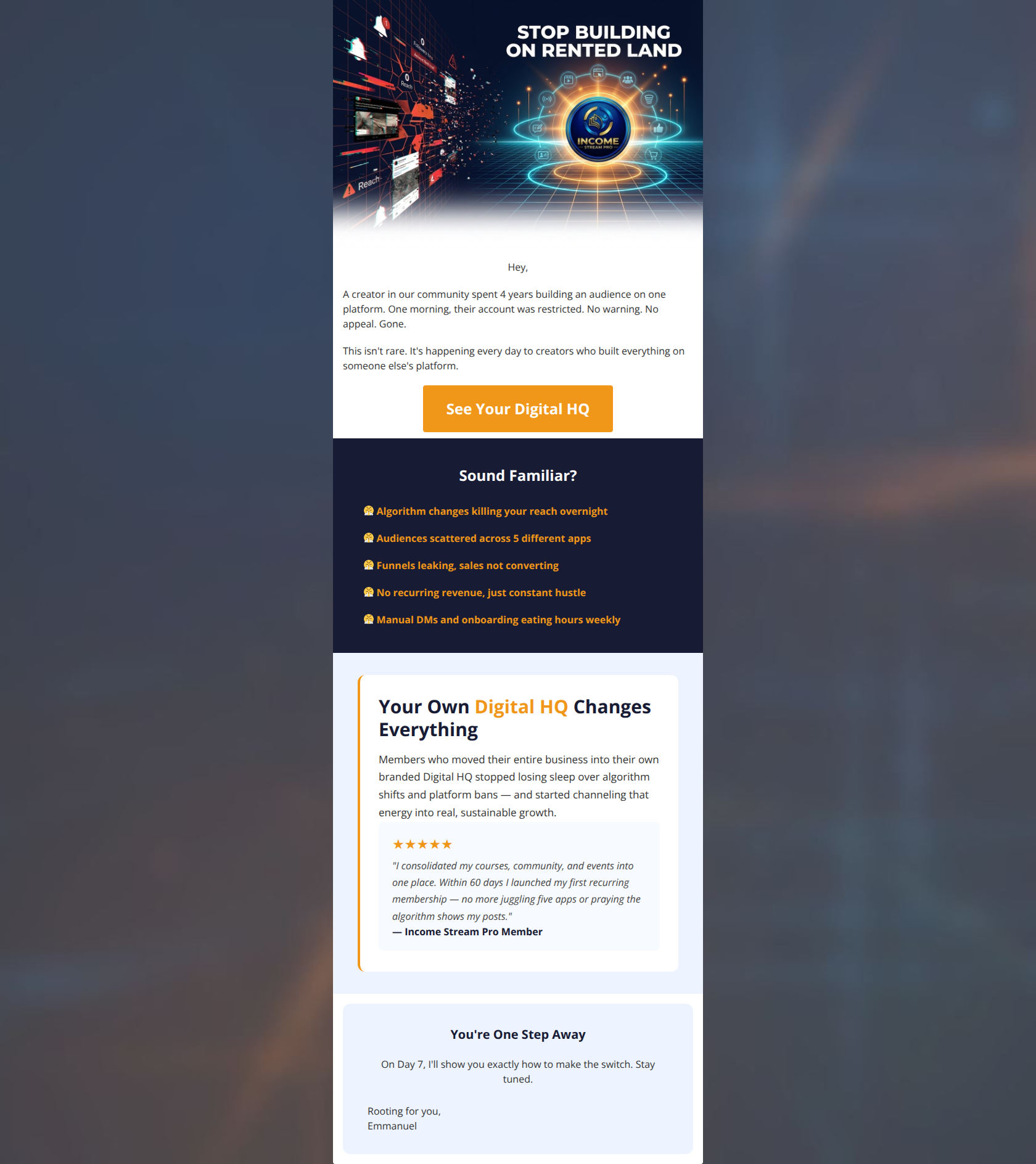 The email starts with a highly compelling hook and a strong PAS (Problem, Agitation, Solution) framework that perfectly targets the audience's pain points. However, it sabotages its own conversion potential through a conflicting narrative and poor CTA placement. The email asks users to click at the top, but concludes by telling them to 'Stay tuned' for Day 7, actively discouraging immediate action. Additionally, the lack of a CTA after the persuasive testimonial leaves highly motivated readers stranded without a clear next step.