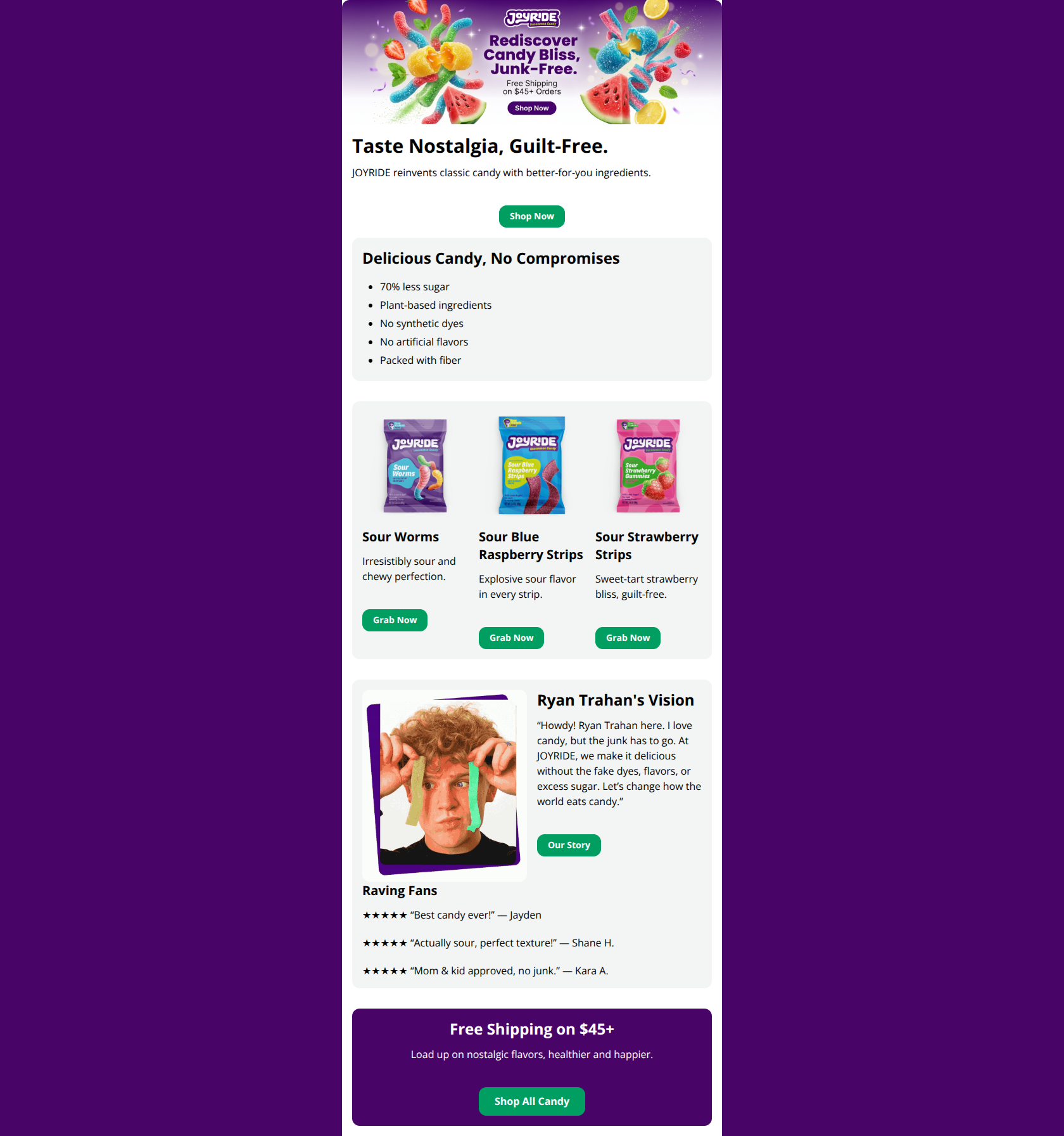 This email delivers a strong conversion-focused experience with a visually compelling hero that immediately conveys the brand's junk-free candy value prop and hooks with free shipping, likely outperforming average ecommerce emails in click potential. Biggest strength: Crystal-clear hero image integrating headline, offer, and CTA for instant impact. Biggest weakness: Absence of pricing on product cards forces extra cognitive load and mental math, diluting purchase intent.