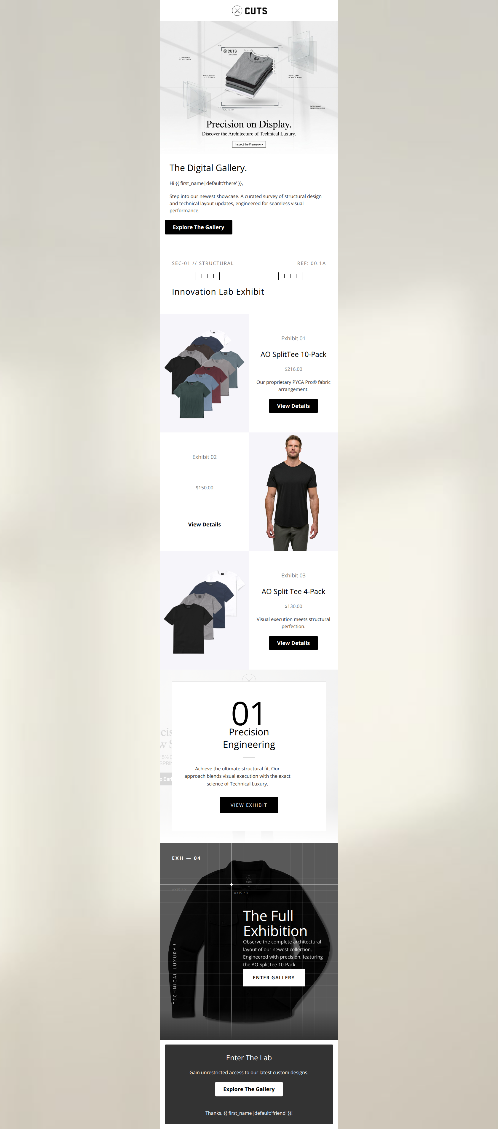 This email features a striking, on-brand visual design that perfectly captures the 'Technical Luxury' aesthetic, but severely undermines its conversion potential with overly abstract, jargon-heavy copywriting. The single biggest strength is its clean, high-contrast checkerboard layout, while the most glaring weakness is an over-reliance on a 'museum exhibition' metaphor that obscures the actual product value and confuses the call to action.