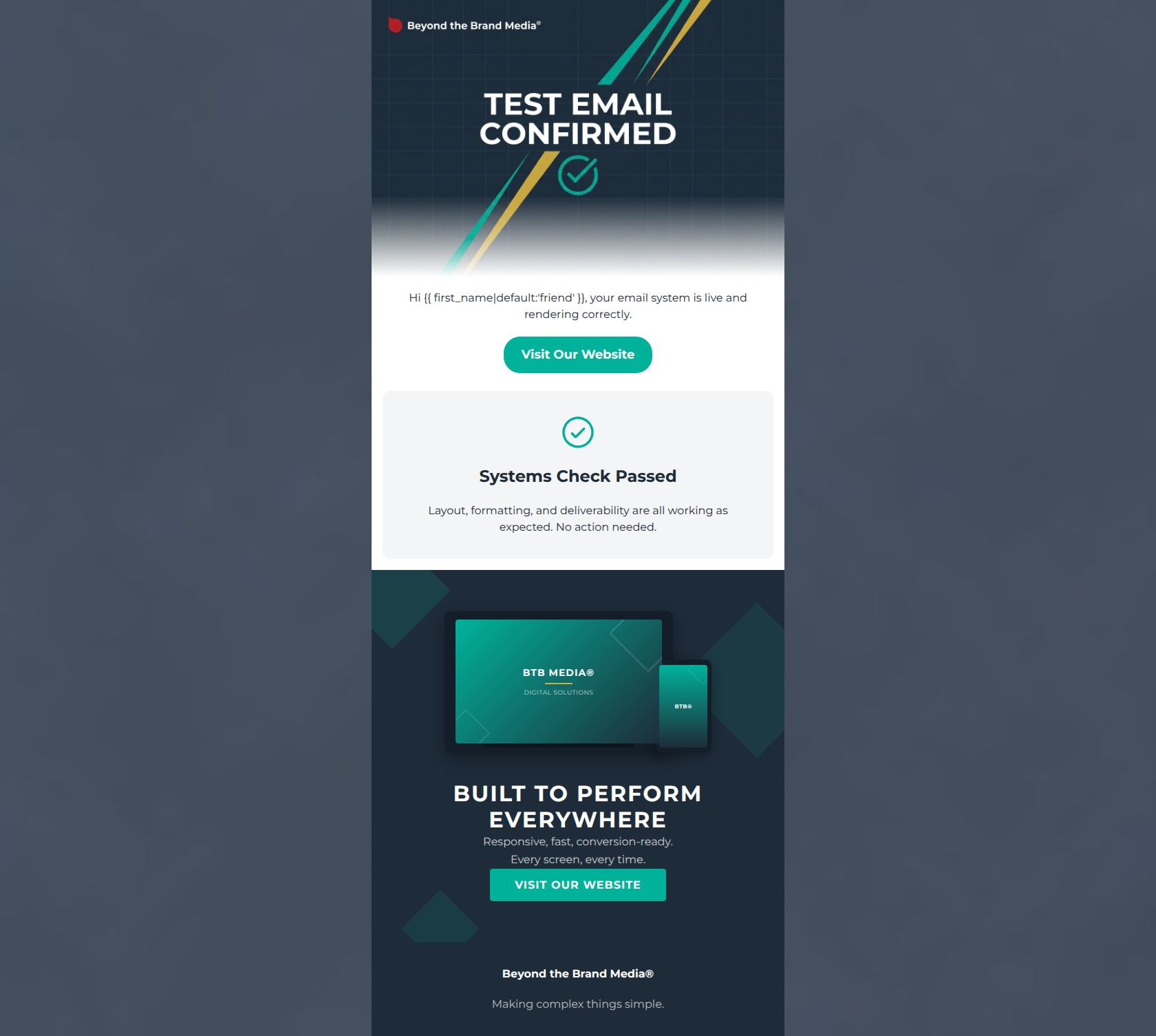 40/100CRITICAL FAILURE: The email content contains a fatal messaging contradiction. It explicitly tells the recipient 'No action needed' and is formatted as an internal IT 'Systems Check' notification, yet it contains primary CTAs asking the user to visit the website. This creates absolute cognitive dissonance for a customer and destroys any conversion momentum. Furthermore, an email functioning as a generic 'systems test' provides zero value to an external marketing audience. While the visual design, contrast, and readability are exceptionally strong and highly on-brand, the core content is incoherent for a promotional campaign, capping the overall score heavily.