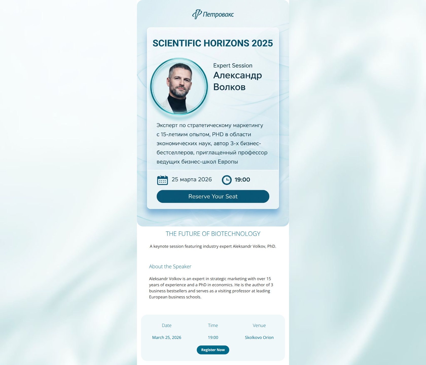 This email succeeds visually with a polished, 'clinical & aquatic' aesthetic that fits the Petrovax brand perfectly, but it fails strategically due to a disjointed language experience. The hero image contains Russian text and a non-functional button visual, while the body copy is in English, creating significant friction and confusion for the user. While the layout is clean, the content relies too heavily on the speaker's resume rather than the attendee's benefit.