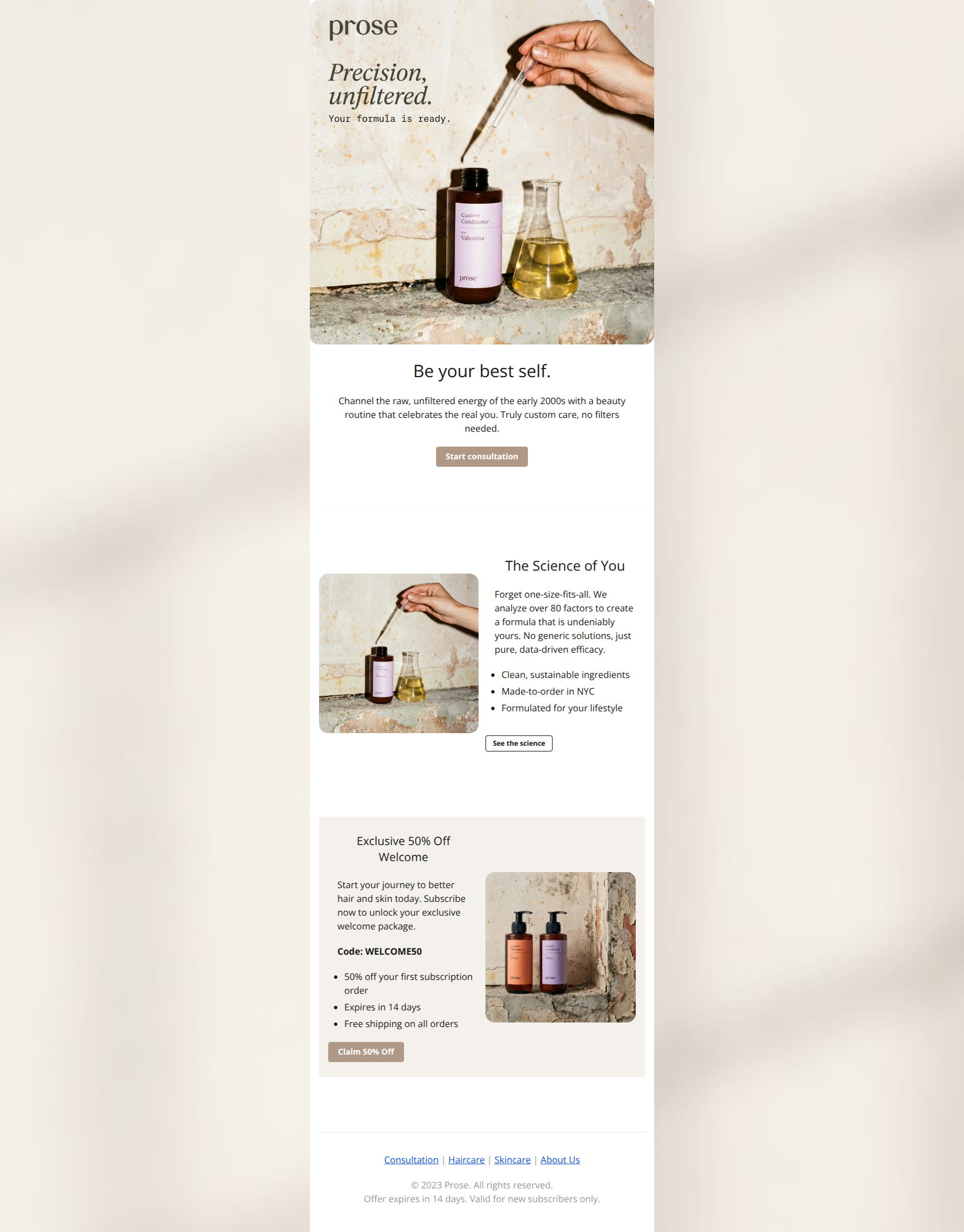 This email is visually polished and contains a high-value offer, but the messaging strategy is disjointed. The hero section's 'early 2000s' reference feels disconnected from the brand's core value proposition of scientific precision and authority, creating cognitive dissonance right at the start. While the visual hierarchy is strong, the most compelling conversion driver (the 50% off discount) is buried at the bottom, forcing users to scroll to find the main reason to convert.