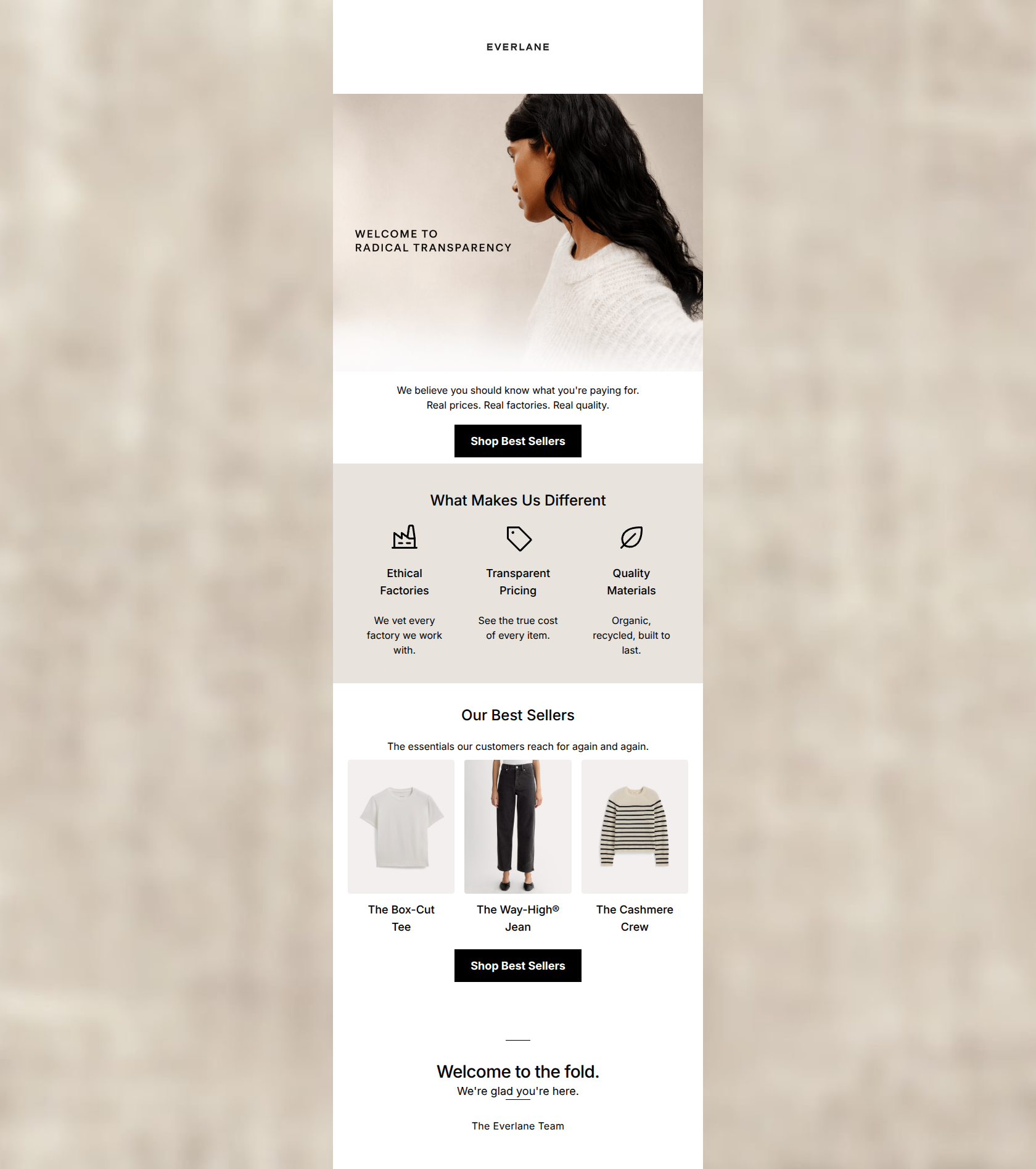 87/100A highly competent, brand-aligned welcome email that effectively communicates Everlane's core differentiator of Radical Transparency. The minimalist design, high-contrast CTAs, and exceptionally concise copy create a premium feel that respects the reader's time. The color execution is strong, utilizing the brand's canvas background (#C8C0B8) to frame the stark white content area, allowing the black CTAs to command attention. However, the lack of a tangible welcome offer means it relies entirely on brand ethos to drive the initial conversion, which may leave some immediate revenue on the table.