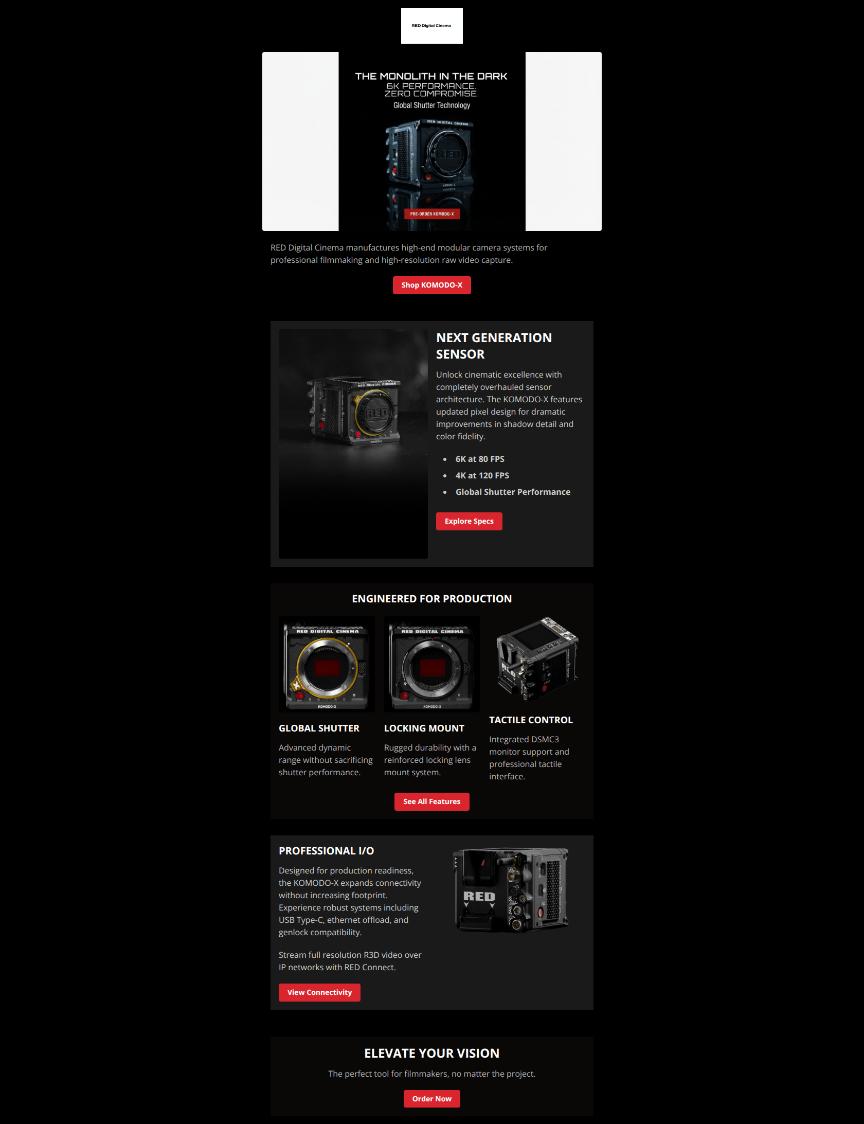 This email is a visually striking, on-brand execution that speaks the language of its professional audience effectively. The dark-mode aesthetic and clear modular layout work perfectly for high-end cinema gear. The single significant weakness is the generic 'About Us' copy immediately following the hero image, which wastes prime real estate that should be used to hype the specific product launch.