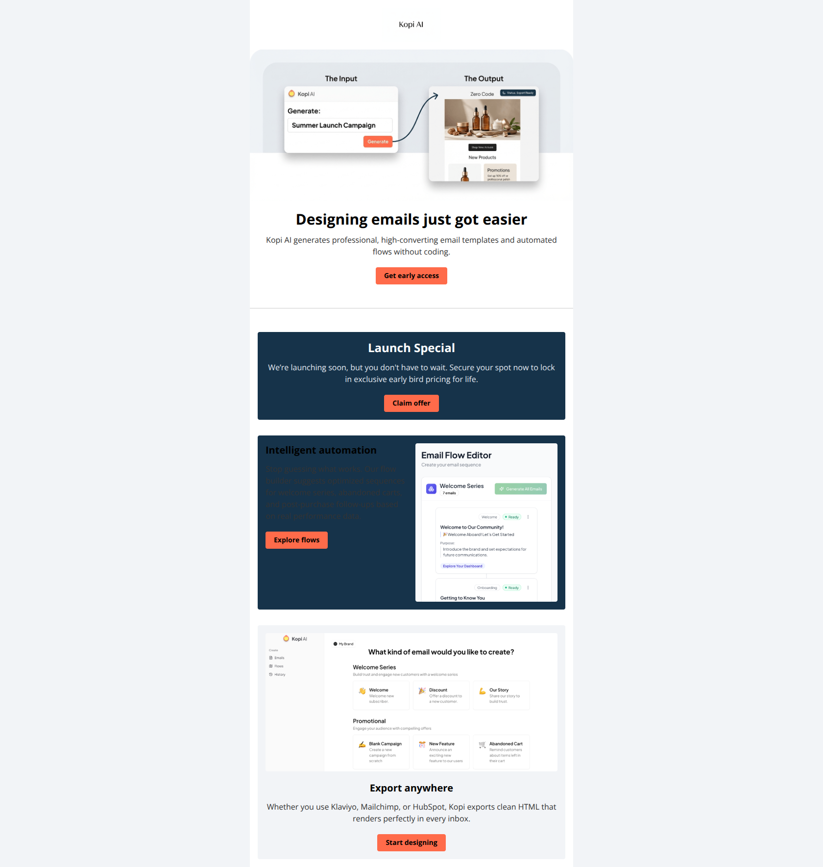 Generate professional email designs like this one in seconds with Kopi AI.
