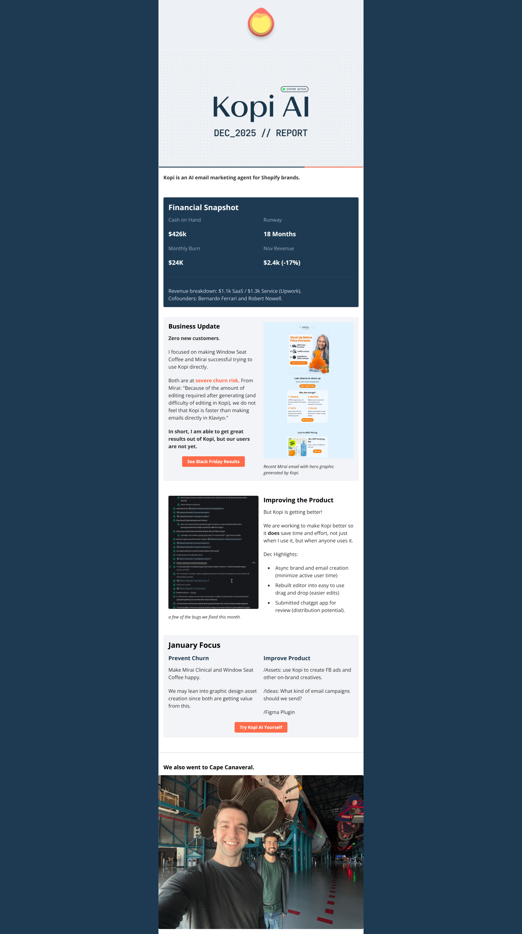 This email is visually polished but suffers from a fundamental mismatch between content and audience. While designed as an internal 'Investor Update' (featuring cash burn and runway), it is being sent to dormant customers who care about product features and ROI, not corporate finance. The layout is clean and scannable, but the hierarchy is upside down—burying the compelling product updates and success stories under irrelevant financial data.
