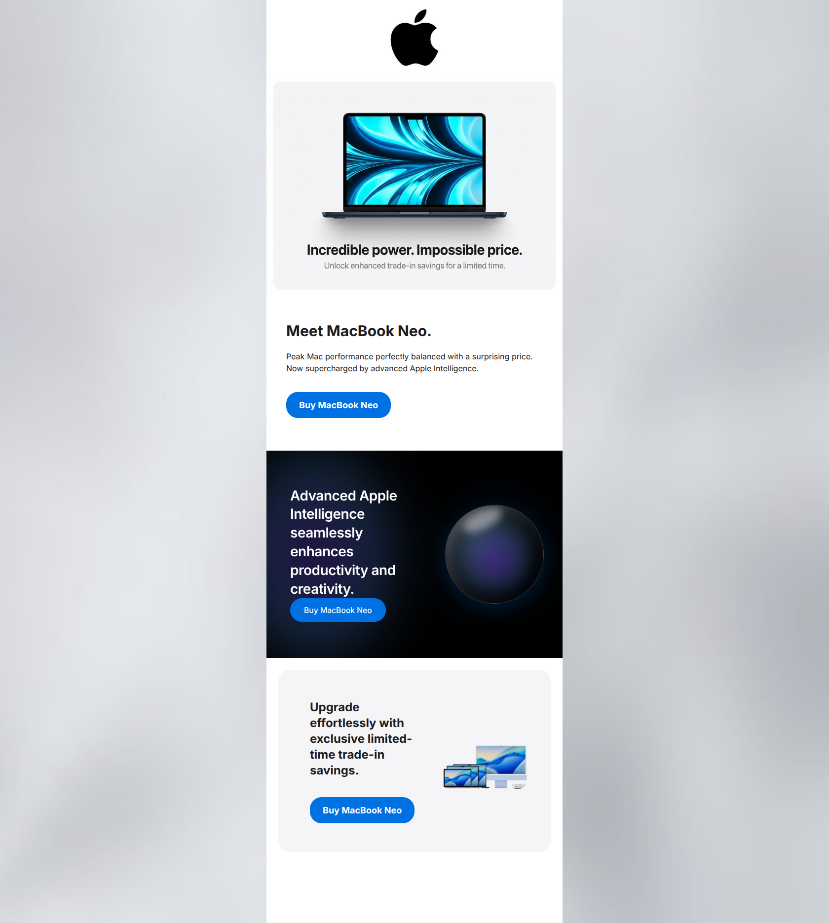 69/100Visually, this email is a strong reflection of Apple's premium brand, utilizing excellent contrast, whitespace, and clean device imagery. However, as a conversion vehicle, it leaves money on the table. The narrative flow is disjointed—introducing trade-in savings in the hero image, resetting to introduce the product, detailing a feature, and then repeating the trade-in offer. Furthermore, the copy relies heavily on vague superlatives ('impossible price', 'enhanced savings') without providing the concrete numbers needed to drive action. Combined with a repetitive, high-friction 'Buy' CTA in every section, the email pushes for the sale without adequately building the case or guiding the user through the consideration phases.