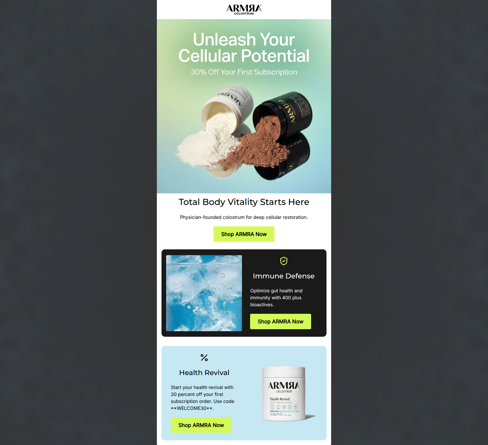 76/100This email is visually striking and effectively utilizes brand colors to create a premium, high-energy aesthetic. It successfully captures the 'clinical yet vibrant' brand identity. However, it leaves money on the table through repetitive, generic Call-to-Action copy and by burying the primary conversion lever—the 30% off promo code—within a block of standard body text. While the design grabs attention, the narrative structure fails to fully substantiate the 'Total Body Vitality' claim, focusing solely on gut/immunity before rushing to the sale.