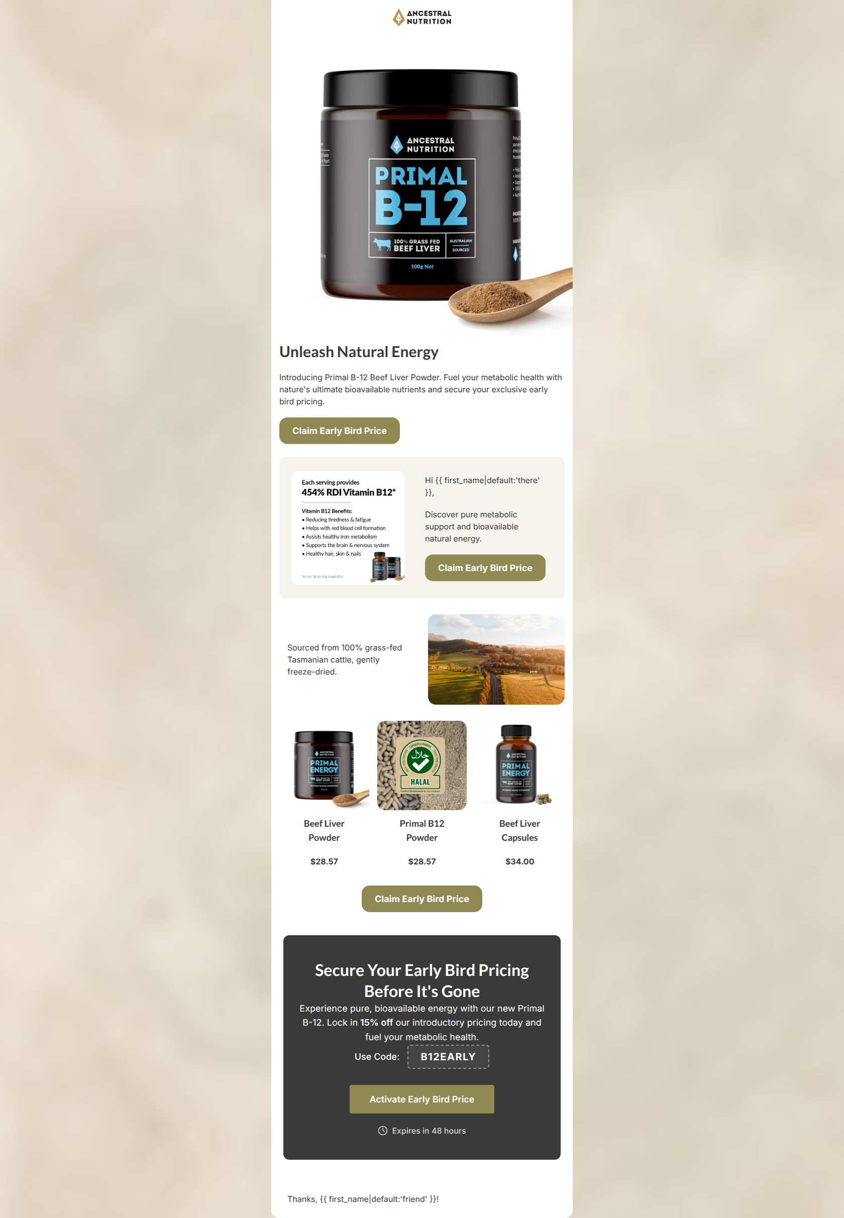 68/100This email successfully establishes a premium, earthy aesthetic that aligns well with Ancestral Nutrition’s brand identity, and it leans heavily into the right benefits (bioavailable energy, metabolic support). However, structurally, it suffers from a disjointed narrative. The email aggressively pushes an 'Early Bird Price' in multiple CTAs before actually explaining what the offer is (15% off with a code), which creates high friction and click-anxiety. Furthermore, visual inconsistencies in the product grid and awkward personalization placement drag down the overall execution. It works at a basic level but requires structural tightening to maximize conversions.