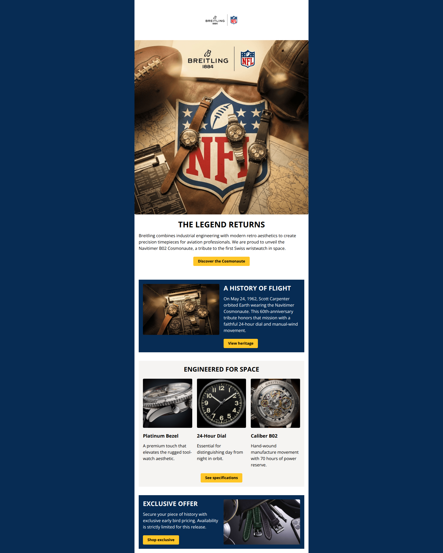 This email is a visually polished, premium execution that suffers from a severe content disconnect in the most critical area: the Hero section. While the layout, color contrast, and feature breakdown are excellent, the hero image (NFL themed) completely contradicts the copy (Space/Cosmonaute themed), causing immediate cognitive dissonance that likely creates high bounce rates.