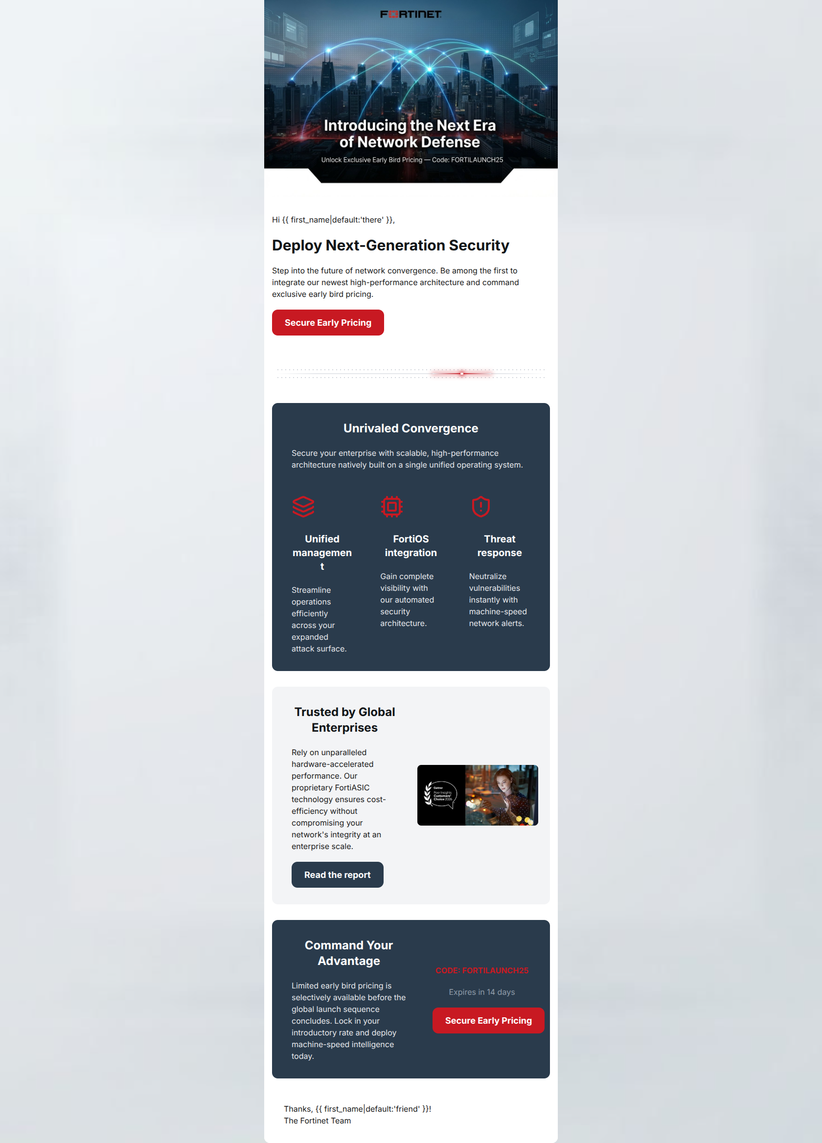 68/100This email attempts to build excitement for a new product launch but commits a cardinal sin for technical B2B marketing: it asks for a commercial click ('Secure Early Pricing') without ever explicitly stating what the product is. While visually structured and on-brand, the reliance on vague buzzwords ('Next Era', 'Next-Generation Security') frustrates a highly technical IT/Security audience that demands concrete specifications. Furthermore, severe readability issues in the feature grid and a low-contrast promo code undermine the premium aesthetic.