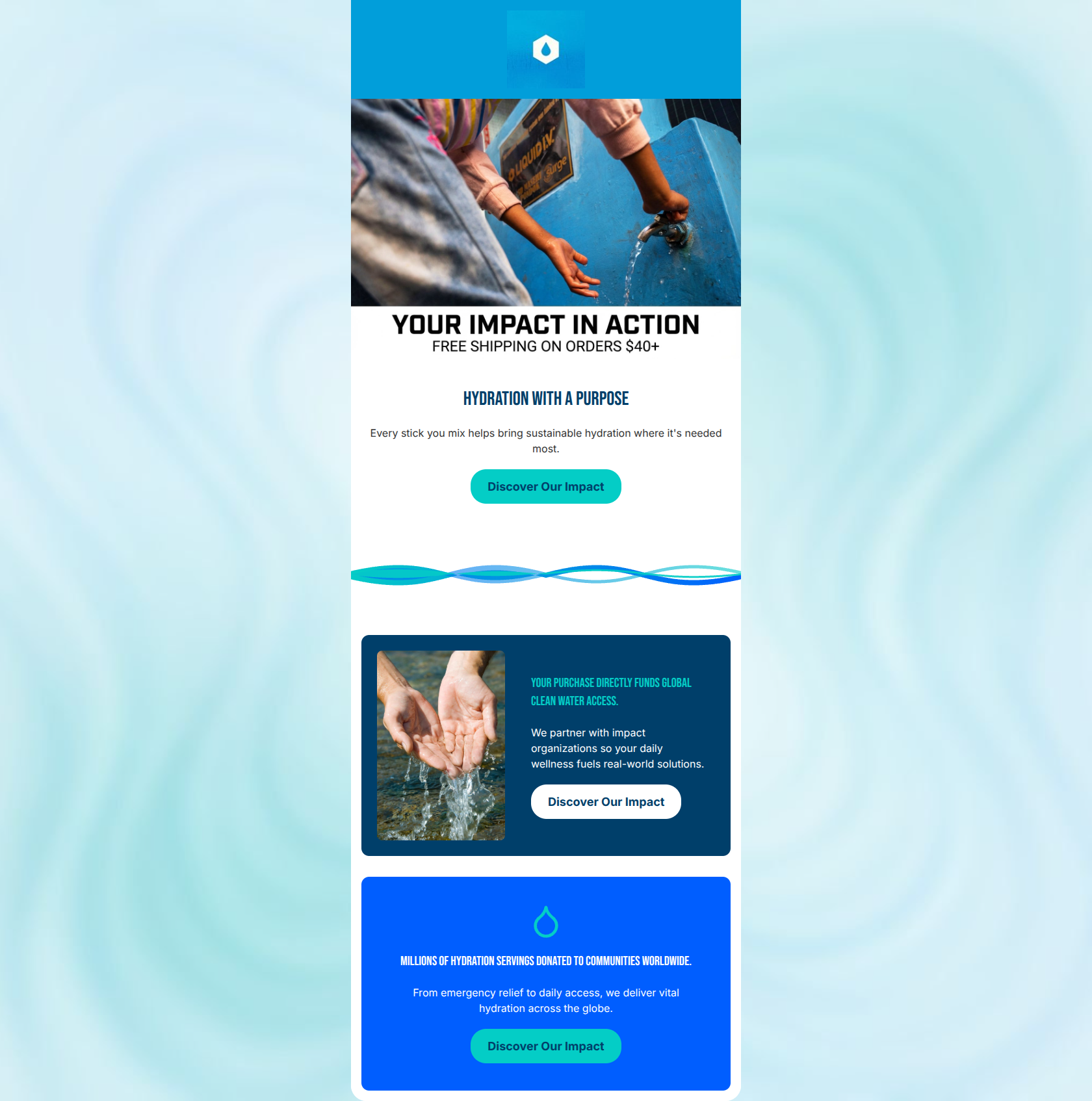 67/100This email effectively communicates Liquid I.V.'s core social mission with strong, emotional imagery and a clear layout. However, it suffers from a one-dimensional approach to conversion. By exclusively using repetitive, informational CTAs ('Discover Our Impact') and omitting any direct path to purchase, the email successfully builds brand affinity but fails to capture the revenue that should naturally follow that goodwill. The copy is also highly repetitive, stating the same overarching mission across three different sections rather than building a compelling narrative.