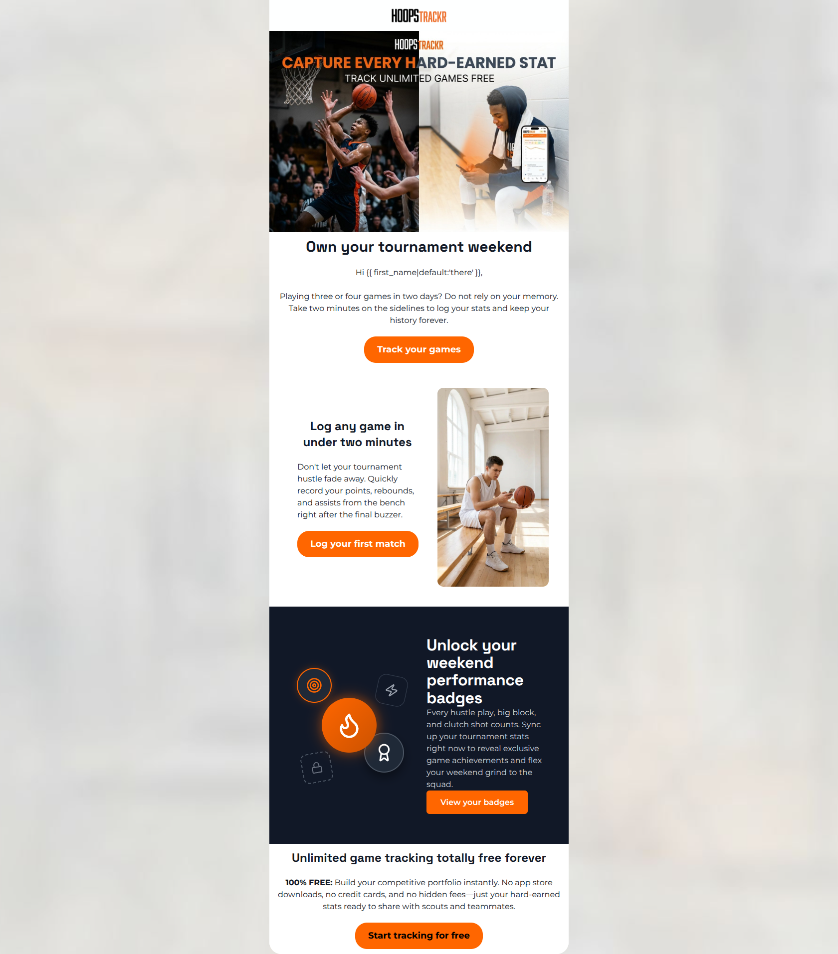 86/100This email is a highly effective, conversion-focused asset that perfectly translates the HoopsTrackR brand voice into a compelling narrative. By anchoring the message in a highly specific, relatable scenario (the tournament weekend), the email immediately captures attention and addresses the core user pain point: losing track of performance over multiple games. The inverted pyramid flow works beautifully, transitioning from a timely hook to operational ease ('under two minutes'), psychological reward ('badges'), and finally, a risk-free value proposition ('100% FREE'). The primary weakness lies in the hero image's baked-in text, which creates visual clutter and competes with the actual HTML headline. Overall, the contrast is sharp, the copy is excellent, and the layout drives the eye naturally toward the CTAs.