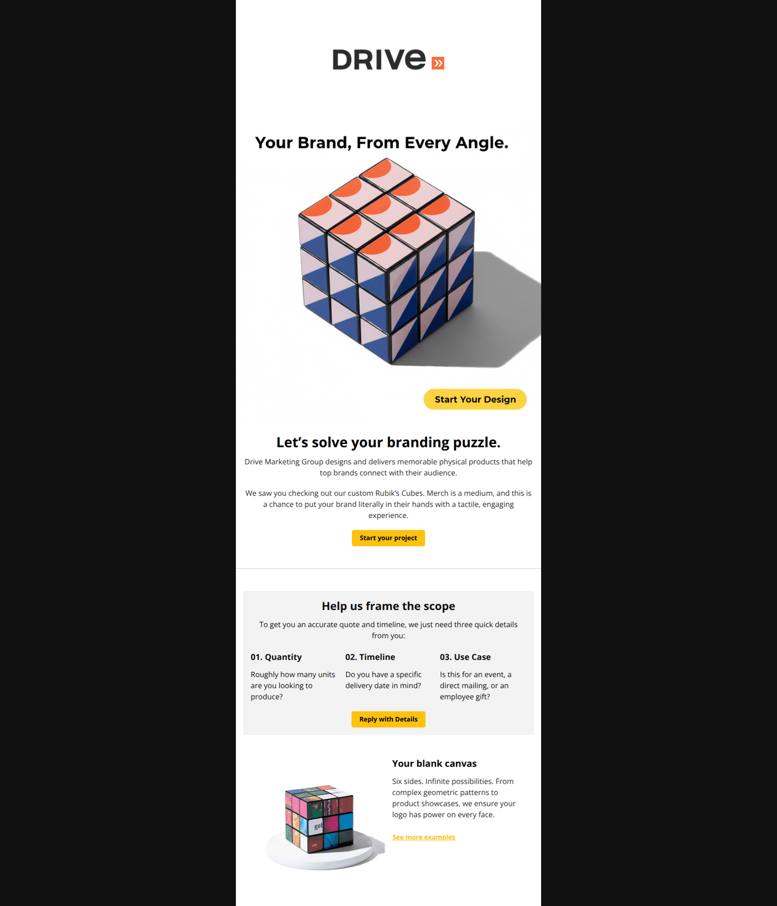 This is a visually engaging behavioral retargeting email with strong product relevance and clever copy ("solve your branding puzzle"). While the visual hierarchy is generally solid, the email suffers from significant accessibility issues regarding color contrast and a high-friction conversion mechanic by relying on `mailto` links for primary actions. The button inconsistency seen in the visual render also dilutes the brand polish.