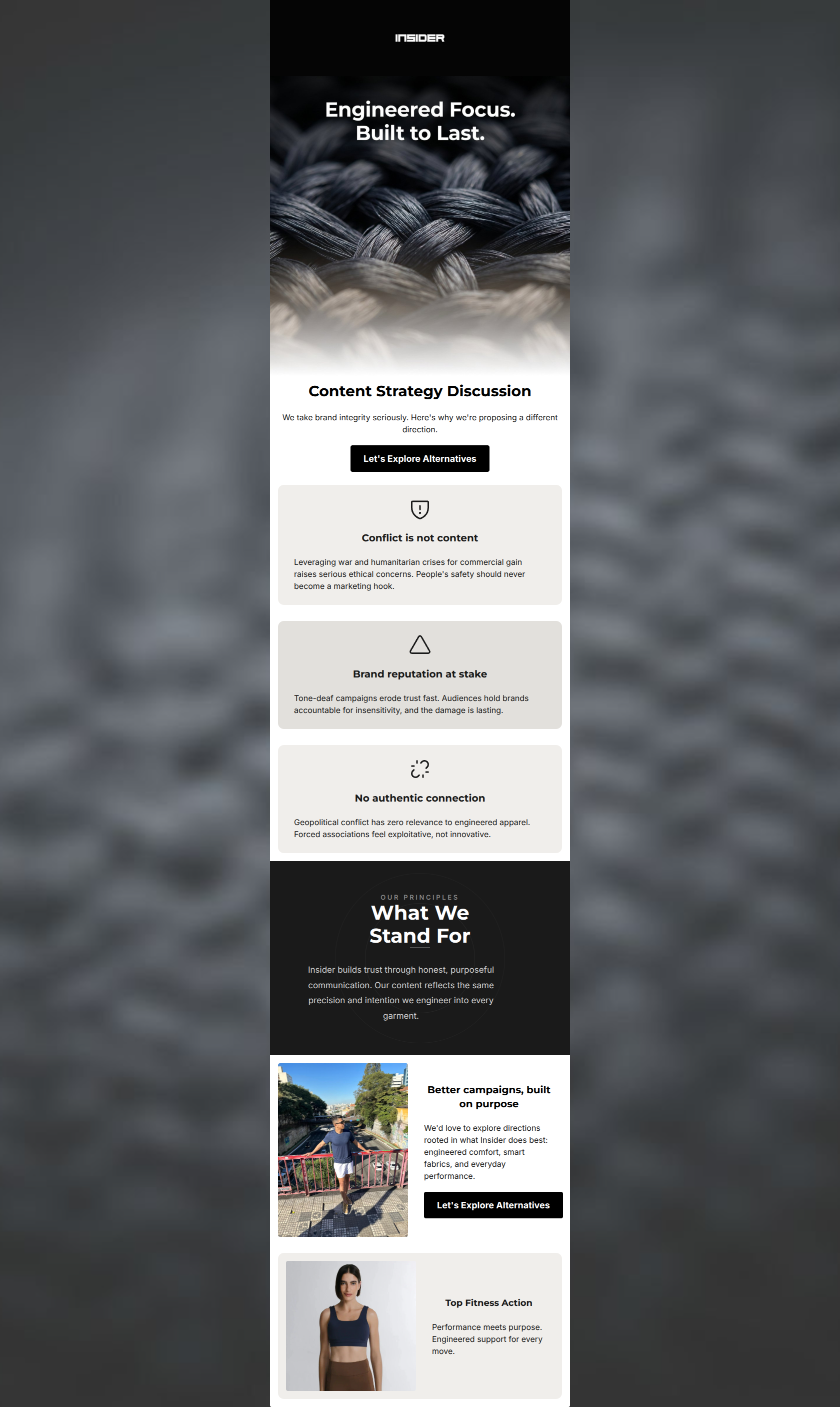 CRITICAL FAILURE: The main body copy is completely incoherent for a consumer-facing marketing campaign. It reads as an internal agency memo discussing 'geopolitical conflict' and 'brand reputation' rather than selling techwear. Because it fails to address the customer or offer a reason to buy, it fundamentally fails as a conversion vehicle, capping its score. The visual layout and structural scaffolding are competent, but the messaging requires a complete overhaul to align with the brand's actual product benefits.