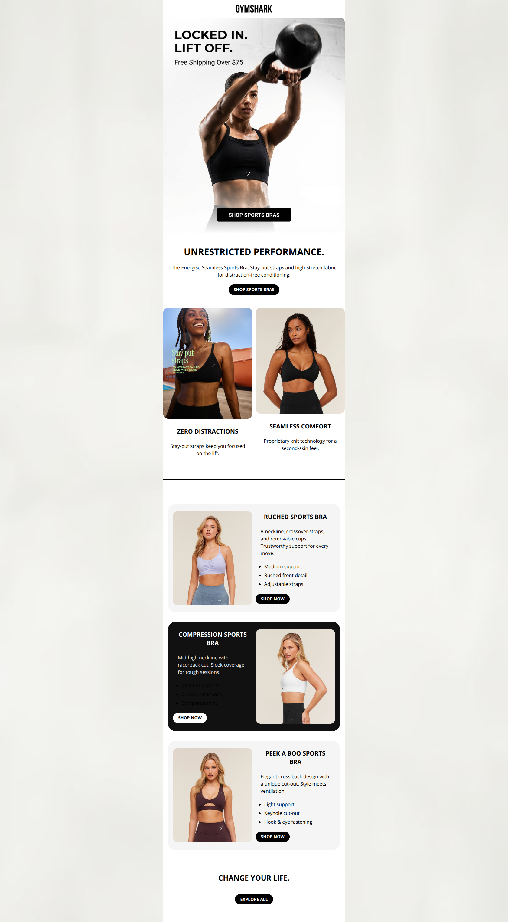 This is a strong, cohesive example of brand-led product storytelling. The email excels at connecting features (seamless knit) to benefits (distraction-free conditioning) using a clean, readable layout. However, it leaves conversions on the table by using generic 'Shop Now' buttons for specific items and missing critical social proof elements like star ratings on the product cards.