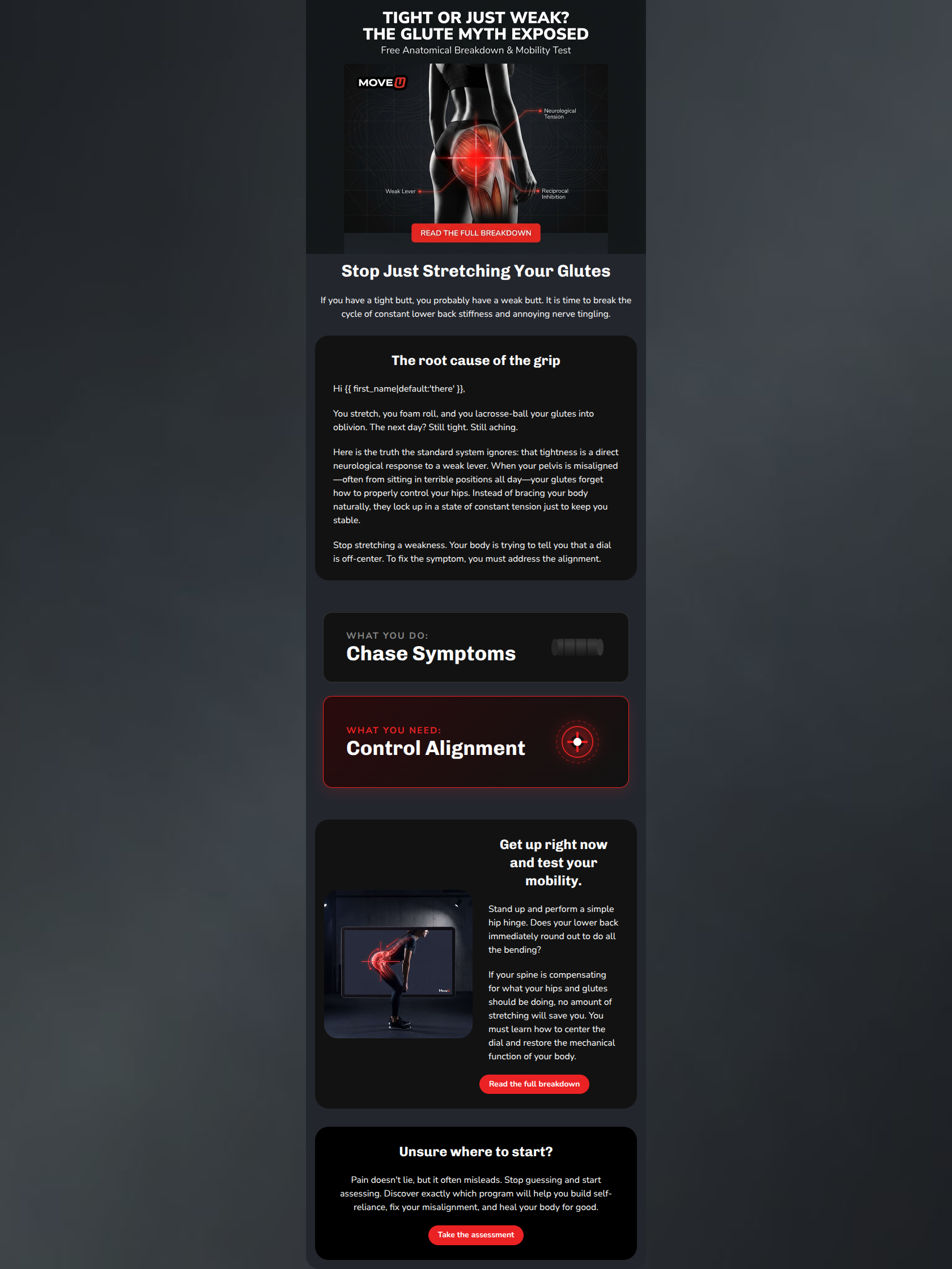 This email delivers a strong, highly persuasive on-page experience that perfectly captures MoveU's authoritative, 'tough love' brand voice. Its biggest strength is a compelling narrative flow that hooks the reader by challenging a common misconception, while its primary weakness is a dense block of text in the second section that slows down the momentum and buries the path to the next click.